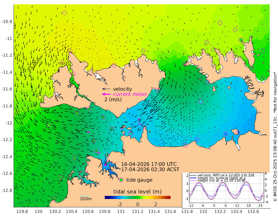 41cm/s -101T +4cm/s rms + 6cm/s 51T. Darwin_C1 52m 49cm/s -93T +4cm/s rms + 7cm/s -161T. Darwin_CW1 22m 9cm/s -104T +4cm/s rms + 8cm/s 61T. Darwin_CW2 34m 63cm/s -142T +3cm/s rms + 9cm/s 98T. Darwin_CW3 22m 50cm/s -89T +5cm/s rms + 7cm/s 88T. Darwin_C3 56m 6cm/s -108T +2cm/s rms + 9cm/s -126T. Darwin_CTbW 22m 64cm/s 97T +1cm/s rms + 1cm/s -47T. DARBGF 30m 72cm/s 128T +4cm/s rms + 3cm/s 80T. NRSDAR 19m 81cm Goodrich Bank 13cm Point Jenny 14cm Native Point -4cm Fish Reef -12cm Tapa Bay 71cm Point Fawcett (Offshore) -34cm Burge Point 5cm Munkunuwa 25cm Beagle A -38cm Parsons Bank -31cm Fenton Patches -56cm Hancox Shoal Area -53cm Nightcliff -71cm Darwin -35cm Charles Point Patches -102cm Glyde Point -158cm Chambers Bay -182cm Point Stuart -115cm Cape Hotham -142cm Christine Reef -208cm West Alligator Head -244cm East Field Island -122cm Two Hills Bay -121cm Camp Point -16cm Medina Inlet South 72cm South Barlow Point 84cm St. Asaph Bay 88cm Cape Van Dieman 77cm Snake Bay 78cm Cache Point 50cm Point Jahleel (Off) -1cm Cape Don 48cm Port Essington 53cm Smith Point - West 47cm NW Peacock Island 57cm North Of Jones Shoal 19cm Peacock Island 15cm Point David 48cm D'urville Point 10cm Copeland Island 17cm One Tree Point
