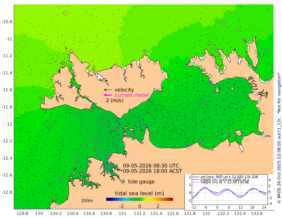 67cm/s -100T +4cm/s rms + 6cm/s 51T. Darwin_C1 52m 26cm/s -91T +4cm/s rms + 7cm/s -161T. Darwin_CW1 22m 21cm/s -108T +4cm/s rms + 8cm/s 61T. Darwin_CW2 34m 33cm/s -135T +3cm/s rms + 9cm/s 98T. Darwin_CW3 22m 23cm/s -91T +5cm/s rms + 7cm/s 88T. Darwin_C3 56m 45cm/s -115T +2cm/s rms + 9cm/s -126T. Darwin_CTbW 22m 2cm/s -116T +1cm/s rms + 1cm/s -47T. DARBGF 30m 4cm/s -118T +4cm/s rms + 3cm/s 80T. NRSDAR 19m 46cm Goodrich Bank -10cm Point Jenny -7cm Native Point -11cm Fish Reef -14cm Tapa Bay 21cm Point Fawcett (Offshore) -15cm Burge Point -14cm Munkunuwa -1cm Beagle A -23cm Parsons Bank -20cm Fenton Patches -29cm Hancox Shoal Area -41cm Nightcliff -21cm Darwin -4cm Charles Point Patches -23cm Glyde Point -45cm Chambers Bay -40cm Point Stuart -29cm Cape Hotham -39cm Christine Reef -49cm West Alligator Head -50cm East Field Island -29cm Two Hills Bay -16cm Camp Point -11cm Medina Inlet South 26cm South Barlow Point 33cm St. Asaph Bay 46cm Cape Van Dieman 43cm Snake Bay 41cm Cache Point 28cm Point Jahleel (Off) 8cm Cape Don 30cm Port Essington 23cm Smith Point - West 25cm NW Peacock Island 28cm North Of Jones Shoal 9cm Peacock Island 16cm Point David 22cm D'urville Point 12cm Copeland Island 17cm One Tree Point