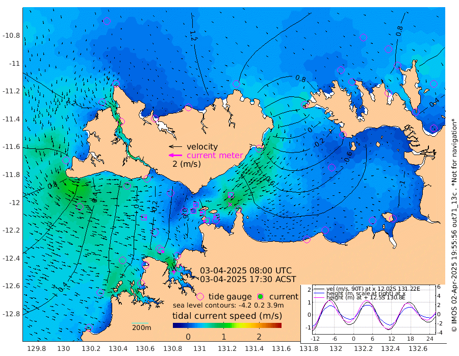56cm/s -101T +4cm/s rms + 6cm/s 51T. Darwin_C1 52m 38cm/s -91T +4cm/s rms + 7cm/s -161T. Darwin_CW1 22m 12cm/s -111T +4cm/s rms + 8cm/s 61T. Darwin_CW2 34m 50cm/s -136T +3cm/s rms + 9cm/s 98T. Darwin_CW3 22m 39cm/s -89T +5cm/s rms + 7cm/s 88T. Darwin_C3 56m 24cm/s -116T +2cm/s rms + 9cm/s -126T. Darwin_CTbW 22m 46cm/s 97T +1cm/s rms + 1cm/s -47T. DARBGF 30m 49cm/s 130T +4cm/s rms + 3cm/s 80T. NRSDAR 19m 112cm Goodrich Bank 35cm Point Jenny 39cm Native Point 30cm Fish Reef 22cm Tapa Bay 94cm Point Fawcett (Offshore) 12cm Burge Point 23cm Munkunuwa 61cm Beagle A -3cm Parsons Bank 17cm Fenton Patches -15cm Hancox Shoal Area -5cm Nightcliff -6cm Darwin 28cm Charles Point Patches -43cm Glyde Point -105cm Chambers Bay -126cm Point Stuart -61cm Cape Hotham -94cm Christine Reef -150cm West Alligator Head -169cm East Field Island -74cm Two Hills Bay -55cm Camp Point 27cm Medina Inlet South 102cm South Barlow Point 110cm St. Asaph Bay 114cm Cape Van Dieman 114cm Snake Bay 106cm Cache Point 80cm Point Jahleel (Off) 32cm Cape Don 77cm Port Essington 75cm Smith Point - West 73cm NW Peacock Island 90cm North Of Jones Shoal 30cm Peacock Island 44cm Point David 71cm D'urville Point 36cm Copeland Island 49cm One Tree Point