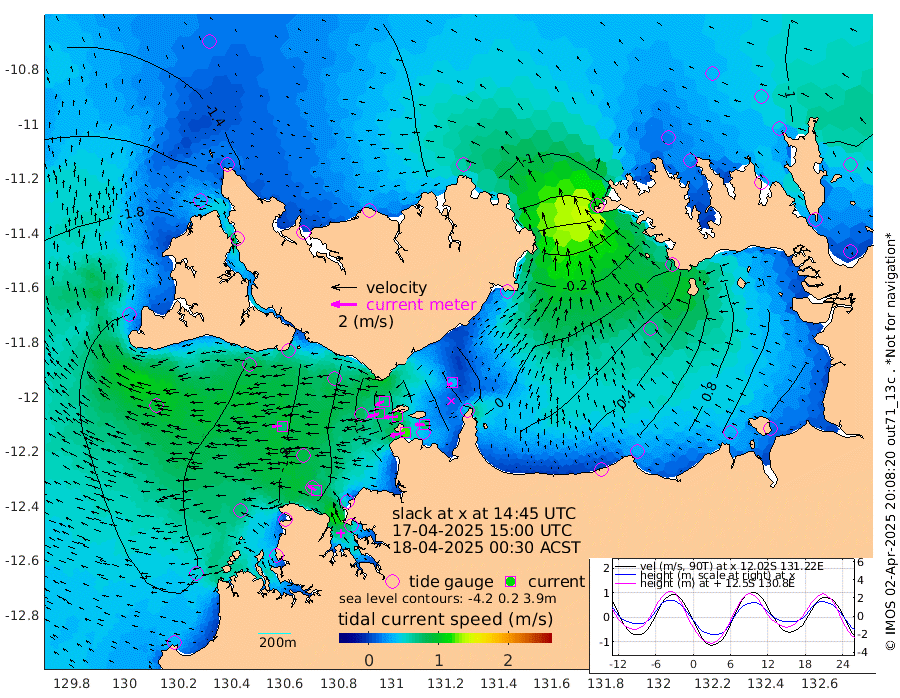 123cm/s -102T +4cm/s rms + 6cm/s 51T. Darwin_C1 52m 76cm/s -87T +4cm/s rms + 7cm/s -161T. Darwin_CW1 22m 86cm/s -108T +4cm/s rms + 8cm/s 61T. Darwin_CW2 34m 36cm/s -121T +3cm/s rms + 9cm/s 98T. Darwin_CW3 22m 104cm/s -92T +5cm/s rms + 7cm/s 88T. Darwin_C3 56m 72cm/s -116T +2cm/s rms + 9cm/s -126T. Darwin_CTbW 22m 76cm/s -91T +1cm/s rms + 1cm/s -47T. DARBGF 30m 72cm/s -59T +4cm/s rms + 3cm/s 80T. NRSDAR 19m -117cm Goodrich Bank -213cm Point Jenny -218cm Native Point -207cm Fish Reef -222cm Tapa Bay -182cm Point Fawcett (Offshore) -219cm Burge Point -220cm Munkunuwa -211cm Beagle A -201cm Parsons Bank -215cm Fenton Patches -185cm Hancox Shoal Area -205cm Nightcliff -206cm Darwin -220cm Charles Point Patches -98cm Glyde Point 15cm Chambers Bay 45cm Point Stuart -50cm Cape Hotham -2cm Christine Reef 63cm West Alligator Head 107cm East Field Island -7cm Two Hills Bay -24cm Camp Point -215cm Medina Inlet South -178cm South Barlow Point -161cm St. Asaph Bay -124cm Cape Van Dieman -126cm Snake Bay -115cm Cache Point -104cm Point Jahleel (Off) -84cm Cape Don -96cm Port Essington -101cm Smith Point - West -91cm NW Peacock Island -90cm North Of Jones Shoal -30cm Peacock Island -67cm Point David -95cm D'urville Point -60cm Copeland Island -67cm One Tree Point