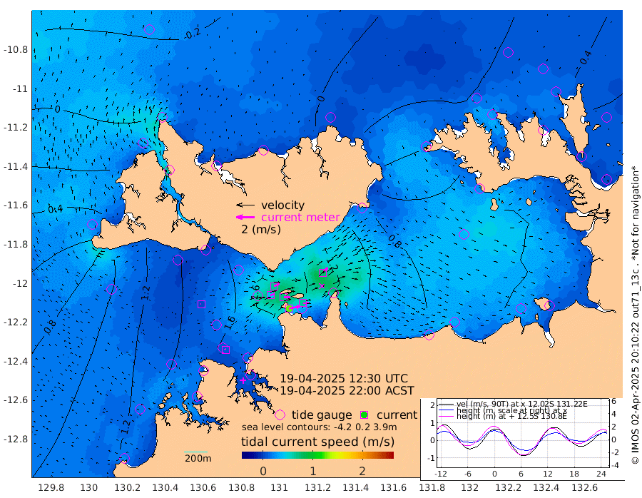 127cm/s 78T +4cm/s rms + 6cm/s 51T. Darwin_C1 52m 66cm/s 90T +4cm/s rms + 7cm/s -161T. Darwin_CW1 22m 41cm/s 75T +4cm/s rms + 8cm/s 61T. Darwin_CW2 34m 76cm/s 44T +3cm/s rms + 9cm/s 98T. Darwin_CW3 22m 70cm/s 90T +5cm/s rms + 7cm/s 88T. Darwin_C3 56m 65cm/s 64T +2cm/s rms + 9cm/s -126T. Darwin_CTbW 22m 5cm/s -55T +1cm/s rms + 1cm/s -47T. DARBGF 30m 11cm/s -16T +4cm/s rms + 3cm/s 80T. NRSDAR 19m -27cm Goodrich Bank 58cm Point Jenny 58cm Native Point 60cm Fish Reef 81cm Tapa Bay 3cm Point Fawcett (Offshore) 84cm Burge Point 71cm Munkunuwa 33cm Beagle A 105cm Parsons Bank 75cm Fenton Patches 107cm Hancox Shoal Area 101cm Nightcliff 113cm Darwin 89cm Charles Point Patches 91cm Glyde Point 82cm Chambers Bay 87cm Point Stuart 85cm Cape Hotham 75cm Christine Reef 93cm West Alligator Head 86cm East Field Island 76cm Two Hills Bay 71cm Camp Point 75cm Medina Inlet South 7cm South Barlow Point -17cm St. Asaph Bay -24cm Cape Van Dieman -12cm Snake Bay -22cm Cache Point -3cm Point Jahleel (Off) 36cm Cape Don 14cm Port Essington 14cm Smith Point - West 20cm NW Peacock Island -2cm North Of Jones Shoal 3cm Peacock Island 61cm Point David 26cm D'urville Point 64cm Copeland Island 50cm One Tree Point