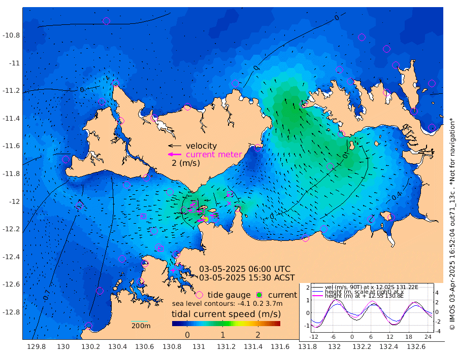 135cm/s -102T +4cm/s rms + 6cm/s 51T. Darwin_C1 52m 77cm/s -89T +4cm/s rms + 7cm/s -161T. Darwin_CW1 22m 62cm/s -107T +4cm/s rms + 8cm/s 61T. Darwin_CW2 34m 51cm/s -129T +3cm/s rms + 9cm/s 98T. Darwin_CW3 22m 78cm/s -91T +5cm/s rms + 7cm/s 88T. Darwin_C3 56m 75cm/s -115T +2cm/s rms + 9cm/s -126T. Darwin_CTbW 22m 30cm/s -91T +1cm/s rms + 1cm/s -47T. DARBGF 30m 26cm/s -73T +4cm/s rms + 3cm/s 80T. NRSDAR 19m 34cm Goodrich Bank -54cm Point Jenny -53cm Native Point -70cm Fish Reef -69cm Tapa Bay -13cm Point Fawcett (Offshore) -70cm Burge Point -84cm Munkunuwa -37cm Beagle A -93cm Parsons Bank -67cm Fenton Patches -81cm Hancox Shoal Area -79cm Nightcliff -89cm Darwin -71cm Charles Point Patches -45cm Glyde Point -10cm Chambers Bay -12cm Point Stuart -34cm Cape Hotham -4cm Christine Reef -12cm West Alligator Head 11cm East Field Island -20cm Two Hills Bay 0cm Camp Point -74cm Medina Inlet South -14cm South Barlow Point 9cm St. Asaph Bay 29cm Cape Van Dieman 23cm Snake Bay 30cm Cache Point 16cm Point Jahleel (Off) -7cm Cape Don 3cm Port Essington -2cm Smith Point - West 1cm NW Peacock Island 17cm North Of Jones Shoal 3cm Peacock Island -15cm Point David -7cm D'urville Point -19cm Copeland Island -10cm One Tree Point