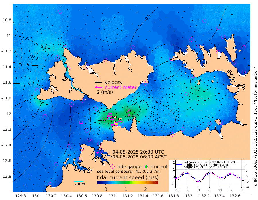 150cm/s -101T +4cm/s rms + 6cm/s 51T. Darwin_C1 52m 98cm/s -91T +4cm/s rms + 7cm/s -161T. Darwin_CW1 22m 50cm/s -105T +4cm/s rms + 8cm/s 61T. Darwin_CW2 34m 79cm/s -134T +3cm/s rms + 9cm/s 98T. Darwin_CW3 22m 88cm/s -90T +5cm/s rms + 7cm/s 88T. Darwin_C3 56m 86cm/s -115T +2cm/s rms + 9cm/s -126T. Darwin_CTbW 22m 7cm/s -127T +1cm/s rms + 1cm/s -47T. DARBGF 30m 6cm/s -176T +4cm/s rms + 3cm/s 80T. NRSDAR 19m -9cm Goodrich Bank -109cm Point Jenny -106cm Native Point -118cm Fish Reef -123cm Tapa Bay -65cm Point Fawcett (Offshore) -129cm Burge Point -106cm Munkunuwa -84cm Beagle A -132cm Parsons Bank -116cm Fenton Patches -132cm Hancox Shoal Area -132cm Nightcliff -150cm Darwin -135cm Charles Point Patches -130cm Glyde Point -130cm Chambers Bay -138cm Point Stuart -124cm Cape Hotham -115cm Christine Reef -148cm West Alligator Head -144cm East Field Island -121cm Two Hills Bay -108cm Camp Point -122cm Medina Inlet South -45cm South Barlow Point -29cm St. Asaph Bay -12cm Cape Van Dieman -19cm Snake Bay -21cm Cache Point -32cm Point Jahleel (Off) -74cm Cape Don -44cm Port Essington -40cm Smith Point - West -41cm NW Peacock Island -32cm North Of Jones Shoal -13cm Peacock Island -64cm Point David -44cm D'urville Point -64cm Copeland Island -65cm One Tree Point