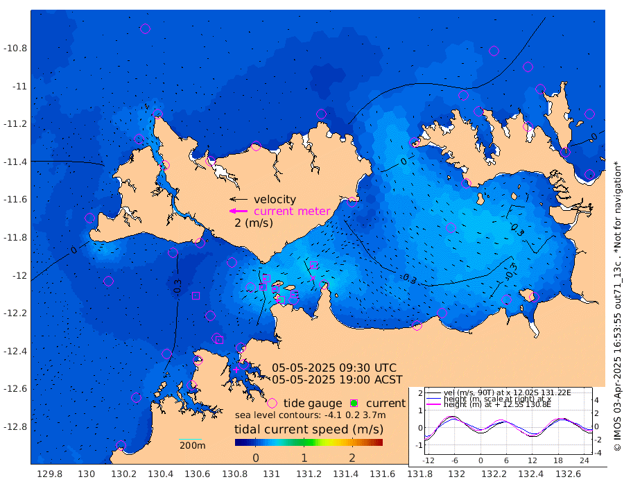 58cm/s -101T +4cm/s rms + 6cm/s 51T. Darwin_C1 52m 23cm/s -89T +4cm/s rms + 7cm/s -161T. Darwin_CW1 22m 21cm/s -108T +4cm/s rms + 8cm/s 61T. Darwin_CW2 34m 33cm/s -134T +3cm/s rms + 9cm/s 98T. Darwin_CW3 22m 26cm/s -91T +5cm/s rms + 7cm/s 88T. Darwin_C3 56m 33cm/s -116T +2cm/s rms + 9cm/s -126T. Darwin_CTbW 22m 6cm/s -102T +1cm/s rms + 1cm/s -47T. DARBGF 30m 5cm/s -89T +4cm/s rms + 3cm/s 80T. NRSDAR 19m 36cm Goodrich Bank -32cm Point Jenny -28cm Native Point -43cm Fish Reef -33cm Tapa Bay 1cm Point Fawcett (Offshore) -40cm Burge Point -32cm Munkunuwa -29cm Beagle A -42cm Parsons Bank -46cm Fenton Patches -42cm Hancox Shoal Area -45cm Nightcliff -41cm Darwin -27cm Charles Point Patches -43cm Glyde Point -58cm Chambers Bay -62cm Point Stuart -47cm Cape Hotham -49cm Christine Reef -71cm West Alligator Head -72cm East Field Island -47cm Two Hills Bay -28cm Camp Point -31cm Medina Inlet South 13cm South Barlow Point 21cm St. Asaph Bay 35cm Cape Van Dieman 37cm Snake Bay 27cm Cache Point 17cm Point Jahleel (Off) -6cm Cape Don 16cm Port Essington 10cm Smith Point - West 13cm NW Peacock Island 23cm North Of Jones Shoal 7cm Peacock Island 10cm Point David 10cm D'urville Point 5cm Copeland Island 9cm One Tree Point
