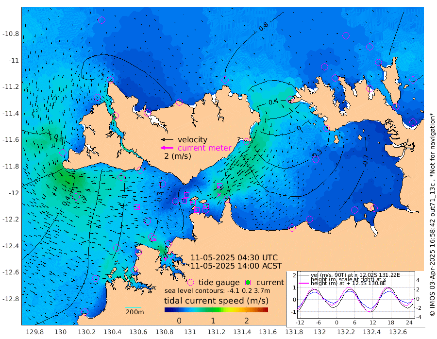 25cm/s -100T +4cm/s rms + 6cm/s 51T. Darwin_C1 52m 45cm/s -90T +4cm/s rms + 7cm/s -161T. Darwin_CW1 22m 9cm/s -104T +4cm/s rms + 8cm/s 61T. Darwin_CW2 34m 41cm/s -139T +3cm/s rms + 9cm/s 98T. Darwin_CW3 22m 46cm/s -90T +5cm/s rms + 7cm/s 88T. Darwin_C3 56m 9cm/s 60T +2cm/s rms + 9cm/s -126T. Darwin_CTbW 22m 41cm/s 98T +1cm/s rms + 1cm/s -47T. DARBGF 30m 45cm/s 130T +4cm/s rms + 3cm/s 80T. NRSDAR 19m 83cm Goodrich Bank 27cm Point Jenny 30cm Native Point 15cm Fish Reef 10cm Tapa Bay 67cm Point Fawcett (Offshore) 4cm Burge Point 11cm Munkunuwa 50cm Beagle A -8cm Parsons Bank 11cm Fenton Patches -19cm Hancox Shoal Area -2cm Nightcliff -22cm Darwin 0cm Charles Point Patches -42cm Glyde Point -84cm Chambers Bay -102cm Point Stuart -53cm Cape Hotham -67cm Christine Reef -119cm West Alligator Head -137cm East Field Island -58cm Two Hills Bay -50cm Camp Point 11cm Medina Inlet South 77cm South Barlow Point 82cm St. Asaph Bay 86cm Cape Van Dieman 87cm Snake Bay 80cm Cache Point 62cm Point Jahleel (Off) 25cm Cape Don 54cm Port Essington 59cm Smith Point - West 57cm NW Peacock Island 67cm North Of Jones Shoal 23cm Peacock Island 33cm Point David 57cm D'urville Point 27cm Copeland Island 37cm One Tree Point