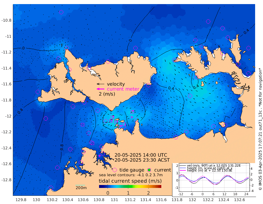 93cm/s 78T +4cm/s rms + 6cm/s 51T. Darwin_C1 52m 44cm/s 91T +4cm/s rms + 7cm/s -161T. Darwin_CW1 22m 29cm/s 73T +4cm/s rms + 8cm/s 61T. Darwin_CW2 34m 52cm/s 44T +3cm/s rms + 9cm/s 98T. Darwin_CW3 22m 42cm/s 89T +5cm/s rms + 7cm/s 88T. Darwin_C3 56m 49cm/s 64T +2cm/s rms + 9cm/s -126T. Darwin_CTbW 22m 7cm/s 88T +1cm/s rms + 1cm/s -47T. DARBGF 30m 6cm/s 88T +4cm/s rms + 3cm/s 80T. NRSDAR 19m -17cm Goodrich Bank 51cm Point Jenny 50cm Native Point 46cm Fish Reef 63cm Tapa Bay 10cm Point Fawcett (Offshore) 56cm Burge Point 51cm Munkunuwa 29cm Beagle A 74cm Parsons Bank 54cm Fenton Patches 78cm Hancox Shoal Area 68cm Nightcliff 70cm Darwin 60cm Charles Point Patches 55cm Glyde Point 52cm Chambers Bay 48cm Point Stuart 51cm Cape Hotham 46cm Christine Reef 49cm West Alligator Head 38cm East Field Island 45cm Two Hills Bay 38cm Camp Point 50cm Medina Inlet South 7cm South Barlow Point -7cm St. Asaph Bay -13cm Cape Van Dieman -10cm Snake Bay -10cm Cache Point 1cm Point Jahleel (Off) 28cm Cape Don 16cm Port Essington 20cm Smith Point - West 23cm NW Peacock Island 2cm North Of Jones Shoal 4cm Peacock Island 54cm Point David 30cm D'urville Point 57cm Copeland Island 42cm One Tree Point