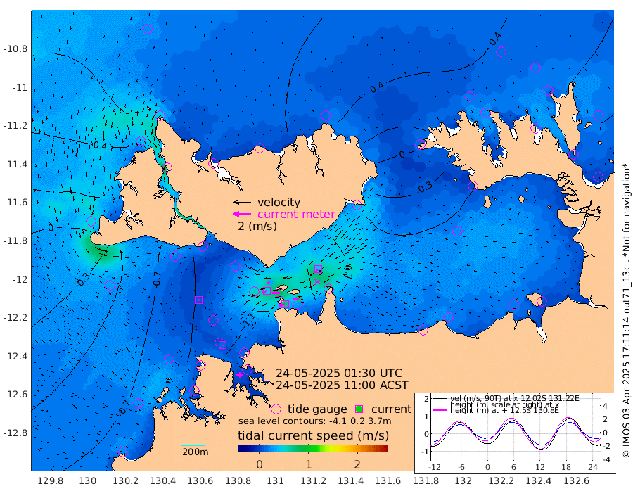 68cm/s -102T +4cm/s rms + 6cm/s 51T. Darwin_C1 52m 69cm/s -90T +4cm/s rms + 7cm/s -161T. Darwin_CW1 22m 44cm/s -107T +4cm/s rms + 8cm/s 61T. Darwin_CW2 34m 44cm/s -137T +3cm/s rms + 9cm/s 98T. Darwin_CW3 22m 80cm/s -91T +5cm/s rms + 7cm/s 88T. Darwin_C3 56m 33cm/s -115T +2cm/s rms + 9cm/s -126T. Darwin_CTbW 22m 8cm/s 124T +1cm/s rms + 1cm/s -47T. DARBGF 30m 12cm/s 148T +4cm/s rms + 3cm/s 80T. NRSDAR 19m 65cm Goodrich Bank -67cm Point Jenny -64cm Native Point -67cm Fish Reef -85cm Tapa Bay 11cm Point Fawcett (Offshore) -96cm Burge Point -75cm Munkunuwa -36cm Beagle A -96cm Parsons Bank -86cm Fenton Patches -105cm Hancox Shoal Area -107cm Nightcliff -110cm Darwin -87cm Charles Point Patches -91cm Glyde Point -101cm Chambers Bay -97cm Point Stuart -82cm Cape Hotham -90cm Christine Reef -109cm West Alligator Head -111cm East Field Island -68cm Two Hills Bay -75cm Camp Point -76cm Medina Inlet South 24cm South Barlow Point 40cm St. Asaph Bay 63cm Cape Van Dieman 63cm Snake Bay 60cm Cache Point 41cm Point Jahleel (Off) -7cm Cape Don 31cm Port Essington 34cm Smith Point - West 34cm NW Peacock Island 47cm North Of Jones Shoal 15cm Peacock Island 6cm Point David 30cm D'urville Point 0cm Copeland Island 11cm One Tree Point