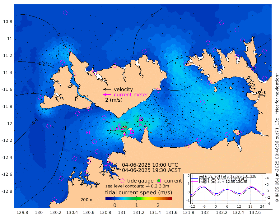 64cm/s -101T +4cm/s rms + 6cm/s 51T. Darwin_C1 52m 40cm/s -90T +4cm/s rms + 7cm/s -161T. Darwin_CW1 22m 43cm/s -106T +4cm/s rms + 8cm/s 61T. Darwin_CW2 34m 37cm/s -136T +3cm/s rms + 9cm/s 98T. Darwin_CW3 22m 70cm/s -91T +5cm/s rms + 7cm/s 88T. Darwin_C3 56m 36cm/s -115T +2cm/s rms + 9cm/s -126T. Darwin_CTbW 22m 15cm/s -102T +1cm/s rms + 1cm/s -47T. DARBGF 30m 10cm/s -80T +4cm/s rms + 3cm/s 80T. NRSDAR 19m 6cm Goodrich Bank -91cm Point Jenny -86cm Native Point -106cm Fish Reef -95cm Tapa Bay -50cm Point Fawcett (Offshore) -108cm Burge Point -86cm Munkunuwa -87cm Beagle A -102cm Parsons Bank -111cm Fenton Patches -102cm Hancox Shoal Area -113cm Nightcliff -113cm Darwin -99cm Charles Point Patches -95cm Glyde Point -99cm Chambers Bay -97cm Point Stuart -92cm Cape Hotham -86cm Christine Reef -106cm West Alligator Head -104cm East Field Island -85cm Two Hills Bay -69cm Camp Point -97cm Medina Inlet South -32cm South Barlow Point -20cm St. Asaph Bay 5cm Cape Van Dieman 3cm Snake Bay -5cm Cache Point -15cm Point Jahleel (Off) -43cm Cape Don -16cm Port Essington -21cm Smith Point - West -16cm NW Peacock Island -11cm North Of Jones Shoal -5cm Peacock Island -17cm Point David -20cm D'urville Point -20cm Copeland Island -22cm One Tree Point