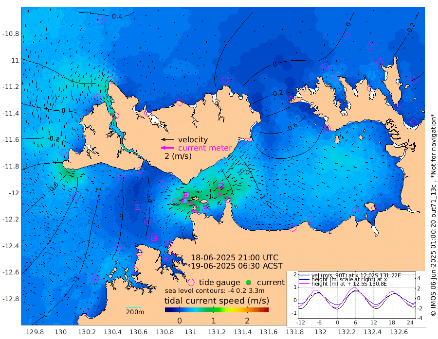 95cm/s -101T +4cm/s rms + 6cm/s 51T. Darwin_C1 52m 59cm/s -90T +4cm/s rms + 7cm/s -161T. Darwin_CW1 22m 50cm/s -107T +4cm/s rms + 8cm/s 61T. Darwin_CW2 34m 57cm/s -134T +3cm/s rms + 9cm/s 98T. Darwin_CW3 22m 85cm/s -91T +5cm/s rms + 7cm/s 88T. Darwin_C3 56m 54cm/s -115T +2cm/s rms + 9cm/s -126T. Darwin_CTbW 22m 8cm/s 126T +1cm/s rms + 1cm/s -47T. DARBGF 30m 14cm/s 148T +4cm/s rms + 3cm/s 80T. NRSDAR 19m 35cm Goodrich Bank -86cm Point Jenny -84cm Native Point -84cm Fish Reef -102cm Tapa Bay -14cm Point Fawcett (Offshore) -112cm Burge Point -87cm Munkunuwa -54cm Beagle A -118cm Parsons Bank -100cm Fenton Patches -122cm Hancox Shoal Area -120cm Nightcliff -130cm Darwin -108cm Charles Point Patches -111cm Glyde Point -122cm Chambers Bay -119cm Point Stuart -102cm Cape Hotham -112cm Christine Reef -130cm West Alligator Head -128cm East Field Island -95cm Two Hills Bay -94cm Camp Point -94cm Medina Inlet South -4cm South Barlow Point 16cm St. Asaph Bay 32cm Cape Van Dieman 29cm Snake Bay 27cm Cache Point 10cm Point Jahleel (Off) -41cm Cape Don -5cm Port Essington -3cm Smith Point - West -4cm NW Peacock Island 14cm North Of Jones Shoal 2cm Peacock Island -35cm Point David -9cm D'urville Point -39cm Copeland Island -30cm One Tree Point