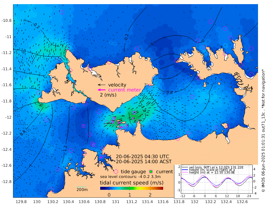 75cm/s 78T +4cm/s rms + 6cm/s 51T. Darwin_C1 52m 52cm/s 89T +4cm/s rms + 7cm/s -161T. Darwin_CW1 22m 52cm/s 72T +4cm/s rms + 8cm/s 61T. Darwin_CW2 34m 47cm/s 47T +3cm/s rms + 9cm/s 98T. Darwin_CW3 22m 85cm/s 90T +5cm/s rms + 7cm/s 88T. Darwin_C3 56m 43cm/s 65T +2cm/s rms + 9cm/s -126T. Darwin_CTbW 22m 9cm/s -52T +1cm/s rms + 1cm/s -47T. DARBGF 30m 16cm/s -36T +4cm/s rms + 3cm/s 80T. NRSDAR 19m -31cm Goodrich Bank 91cm Point Jenny 91cm Native Point 96cm Fish Reef 105cm Tapa Bay 17cm Point Fawcett (Offshore) 125cm Burge Point 93cm Munkunuwa 74cm Beagle A 120cm Parsons Bank 120cm Fenton Patches 120cm Hancox Shoal Area 130cm Nightcliff 135cm Darwin 107cm Charles Point Patches 120cm Glyde Point 125cm Chambers Bay 130cm Point Stuart 112cm Cape Hotham 116cm Christine Reef 143cm West Alligator Head 147cm East Field Island 103cm Two Hills Bay 101cm Camp Point 101cm Medina Inlet South 10cm South Barlow Point -11cm St. Asaph Bay -30cm Cape Van Dieman -23cm Snake Bay -25cm Cache Point -6cm Point Jahleel (Off) 38cm Cape Don -3cm Port Essington -4cm Smith Point - West -3cm NW Peacock Island -20cm North Of Jones Shoal -5cm Peacock Island 20cm Point David 0cm D'urville Point 22cm Copeland Island 16cm One Tree Point