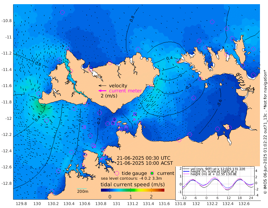 12cm/s -104T +4cm/s rms + 6cm/s 51T. Darwin_C1 52m 22cm/s -87T +4cm/s rms + 7cm/s -161T. Darwin_CW1 22m 7cm/s -110T +4cm/s rms + 8cm/s 61T. Darwin_CW2 34m 21cm/s -142T +3cm/s rms + 9cm/s 98T. Darwin_CW3 22m 25cm/s -89T +5cm/s rms + 7cm/s 88T. Darwin_C3 56m 1cm/s -65T +2cm/s rms + 9cm/s -126T. Darwin_CTbW 22m 26cm/s 96T +1cm/s rms + 1cm/s -47T. DARBGF 30m 28cm/s 128T +4cm/s rms + 3cm/s 80T. NRSDAR 19m 80cm Goodrich Bank 11cm Point Jenny 14cm Native Point 15cm Fish Reef 2cm Tapa Bay 60cm Point Fawcett (Offshore) -4cm Burge Point 11cm Munkunuwa 35cm Beagle A -6cm Parsons Bank 2cm Fenton Patches -19cm Hancox Shoal Area -17cm Nightcliff -12cm Darwin 6cm Charles Point Patches -32cm Glyde Point -71cm Chambers Bay -76cm Point Stuart -38cm Cape Hotham -64cm Christine Reef -89cm West Alligator Head -103cm East Field Island -40cm Two Hills Bay -43cm Camp Point 12cm Medina Inlet South 70cm South Barlow Point 74cm St. Asaph Bay 81cm Cape Van Dieman 84cm Snake Bay 76cm Cache Point 61cm Point Jahleel (Off) 23cm Cape Don 55cm Port Essington 57cm Smith Point - West 55cm NW Peacock Island 64cm North Of Jones Shoal 21cm Peacock Island 29cm Point David 53cm D'urville Point 24cm Copeland Island 34cm One Tree Point
