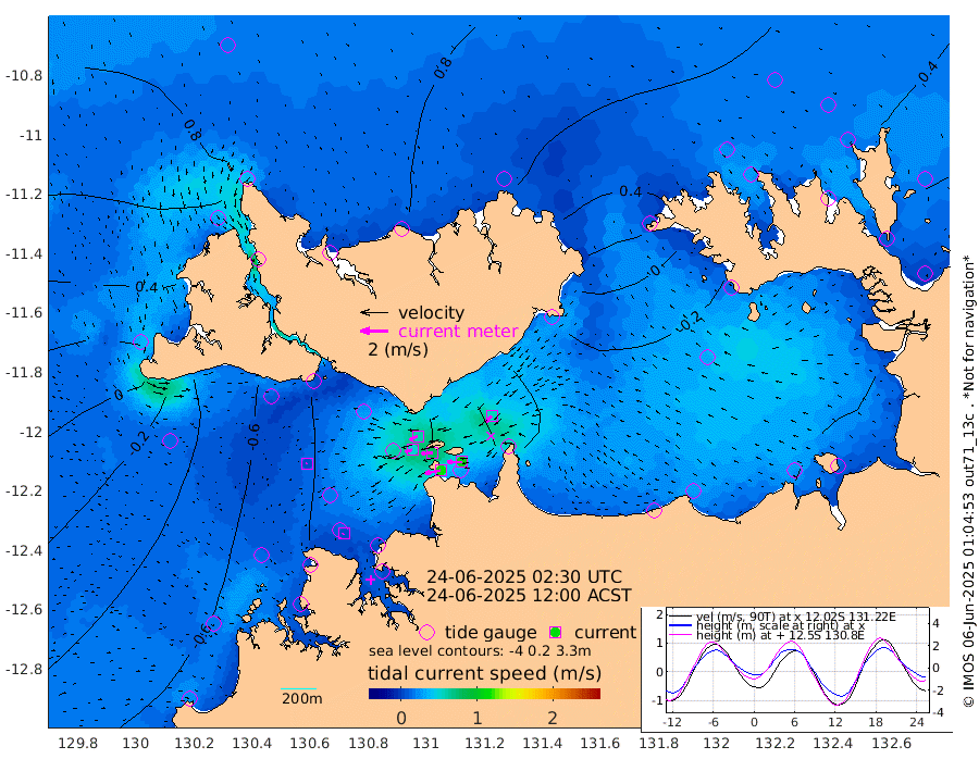 116cm/s -101T +4cm/s rms + 6cm/s 51T. Darwin_C1 52m 106cm/s -90T +4cm/s rms + 7cm/s -161T. Darwin_CW1 22m 51cm/s -108T +4cm/s rms + 8cm/s 61T. Darwin_CW2 34m 58cm/s -134T +3cm/s rms + 9cm/s 98T. Darwin_CW3 22m 80cm/s -91T +5cm/s rms + 7cm/s 88T. Darwin_C3 56m 62cm/s -115T +2cm/s rms + 9cm/s -126T. Darwin_CTbW 22m 5cm/s -132T +1cm/s rms + 1cm/s -47T. DARBGF 30m 6cm/s -128T +4cm/s rms + 3cm/s 80T. NRSDAR 19m 84cm Goodrich Bank -54cm Point Jenny -52cm Native Point -60cm Fish Reef -72cm Tapa Bay 25cm Point Fawcett (Offshore) -83cm Burge Point -78cm Munkunuwa -27cm Beagle A -88cm Parsons Bank -76cm Fenton Patches -88cm Hancox Shoal Area -92cm Nightcliff -92cm Darwin -63cm Charles Point Patches -68cm Glyde Point -62cm Chambers Bay -67cm Point Stuart -60cm Cape Hotham -56cm Christine Reef -79cm West Alligator Head -73cm East Field Island -43cm Two Hills Bay -39cm Camp Point -65cm Medina Inlet South 35cm South Barlow Point 54cm St. Asaph Bay 80cm Cape Van Dieman 81cm Snake Bay 80cm Cache Point 58cm Point Jahleel (Off) 18cm Cape Don 54cm Port Essington 53cm Smith Point - West 56cm NW Peacock Island 72cm North Of Jones Shoal 23cm Peacock Island 31cm Point David 51cm D'urville Point 25cm Copeland Island 39cm One Tree Point