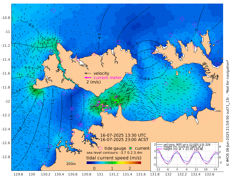 129cm/s 79T +4cm/s rms + 6cm/s 51T. Darwin_C1 52m 83cm/s 93T +4cm/s rms + 7cm/s -161T. Darwin_CW1 22m 73cm/s 71T +4cm/s rms + 8cm/s 61T. Darwin_CW2 34m 80cm/s 44T +3cm/s rms + 9cm/s 98T. Darwin_CW3 22m 118cm/s 89T +5cm/s rms + 7cm/s 88T. Darwin_C3 56m 63cm/s 65T +2cm/s rms + 9cm/s -126T. Darwin_CTbW 22m 9cm/s -48T +1cm/s rms + 1cm/s -47T. DARBGF 30m 20cm/s -36T +4cm/s rms + 3cm/s 80T. NRSDAR 19m -51cm Goodrich Bank 104cm Point Jenny 101cm Native Point 108cm Fish Reef 131cm Tapa Bay 12cm Point Fawcett (Offshore) 137cm Burge Point 111cm Munkunuwa 67cm Beagle A 153cm Parsons Bank 129cm Fenton Patches 163cm Hancox Shoal Area 157cm Nightcliff 167cm Darwin 139cm Charles Point Patches 140cm Glyde Point 151cm Chambers Bay 147cm Point Stuart 132cm Cape Hotham 135cm Christine Reef 161cm West Alligator Head 158cm East Field Island 118cm Two Hills Bay 112cm Camp Point 117cm Medina Inlet South 0cm South Barlow Point -25cm St. Asaph Bay -49cm Cape Van Dieman -45cm Snake Bay -41cm Cache Point -15cm Point Jahleel (Off) 44cm Cape Don 2cm Port Essington 5cm Smith Point - West 6cm NW Peacock Island -20cm North Of Jones Shoal -4cm Peacock Island 47cm Point David 14cm D'urville Point 54cm Copeland Island 36cm One Tree Point