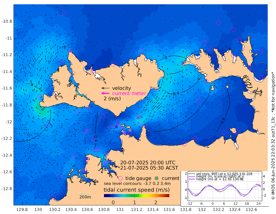 31cm/s 80T +4cm/s rms + 6cm/s 51T. Darwin_C1 52m 59cm/s 91T +4cm/s rms + 7cm/s -161T. Darwin_CW1 22m 7cm/s 73T +4cm/s rms + 8cm/s 61T. Darwin_CW2 34m 34cm/s 37T +3cm/s rms + 9cm/s 98T. Darwin_CW3 22m 29cm/s 94T +5cm/s rms + 7cm/s 88T. Darwin_C3 56m 12cm/s 70T +2cm/s rms + 9cm/s -126T. Darwin_CTbW 22m 18cm/s -77T +1cm/s rms + 1cm/s -47T. DARBGF 30m 24cm/s -57T +4cm/s rms + 3cm/s 80T. NRSDAR 19m -3cm Goodrich Bank 56cm Point Jenny 52cm Native Point 51cm Fish Reef 58cm Tapa Bay 20cm Point Fawcett (Offshore) 68cm Burge Point 32cm Munkunuwa 52cm Beagle A 46cm Parsons Bank 71cm Fenton Patches 65cm Hancox Shoal Area 74cm Nightcliff 65cm Darwin 61cm Charles Point Patches 78cm Glyde Point 108cm Chambers Bay 105cm Point Stuart 78cm Cape Hotham 107cm Christine Reef 118cm West Alligator Head 137cm East Field Island 76cm Two Hills Bay 87cm Camp Point 47cm Medina Inlet South 2cm South Barlow Point 7cm St. Asaph Bay -7cm Cape Van Dieman -12cm Snake Bay 3cm Cache Point 8cm Point Jahleel (Off) 25cm Cape Don -2cm Port Essington -1cm Smith Point - West -3cm NW Peacock Island -1cm North Of Jones Shoal -2cm Peacock Island -7cm Point David -6cm D'urville Point -6cm Copeland Island -4cm One Tree Point