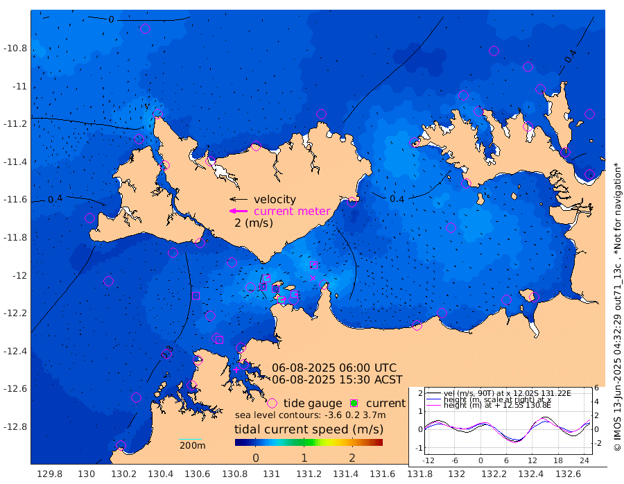 57cm/s 77T +4cm/s rms + 6cm/s 51T. Darwin_C1 52m 27cm/s 80T +4cm/s rms + 7cm/s -161T. Darwin_CW1 22m 9cm/s 79T +4cm/s rms + 8cm/s 61T. Darwin_CW2 34m 28cm/s 45T +3cm/s rms + 9cm/s 98T. Darwin_CW3 22m 5cm/s 94T +5cm/s rms + 7cm/s 88T. Darwin_C3 56m 38cm/s 64T +2cm/s rms + 9cm/s -126T. Darwin_CTbW 22m 6cm/s 92T +1cm/s rms + 1cm/s -47T. DARBGF 30m 7cm/s 104T +4cm/s rms + 3cm/s 80T. NRSDAR 19m -13cm Goodrich Bank 31cm Point Jenny 31cm Native Point 32cm Fish Reef 39cm Tapa Bay 7cm Point Fawcett (Offshore) 37cm Burge Point 26cm Munkunuwa 23cm Beagle A 43cm Parsons Bank 38cm Fenton Patches 46cm Hancox Shoal Area 52cm Nightcliff 47cm Darwin 37cm Charles Point Patches 41cm Glyde Point 36cm Chambers Bay 39cm Point Stuart 40cm Cape Hotham 31cm Christine Reef 39cm West Alligator Head 36cm East Field Island 35cm Two Hills Bay 35cm Camp Point 33cm Medina Inlet South 5cm South Barlow Point -6cm St. Asaph Bay -10cm Cape Van Dieman -2cm Snake Bay -8cm Cache Point 0cm Point Jahleel (Off) 21cm Cape Don 10cm Port Essington 10cm Smith Point - West 13cm NW Peacock Island 5cm North Of Jones Shoal 4cm Peacock Island 40cm Point David 18cm D'urville Point 42cm Copeland Island 34cm One Tree Point