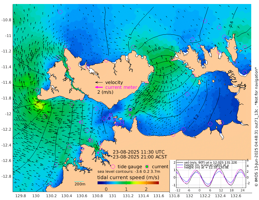 13cm/s -110T +4cm/s rms + 6cm/s 51T. Darwin_C1 52m 7cm/s 66T +4cm/s rms + 7cm/s -161T. Darwin_CW1 22m 1cm/s -12T +4cm/s rms + 8cm/s 61T. Darwin_CW2 34m 24cm/s 26T +3cm/s rms + 9cm/s 98T. Darwin_CW3 22m 17cm/s 94T +5cm/s rms + 7cm/s 88T. Darwin_C3 56m 17cm/s -117T +2cm/s rms + 9cm/s -126T. Darwin_CTbW 22m 59cm/s -85T +1cm/s rms + 1cm/s -47T. DARBGF 30m 68cm/s -54T +4cm/s rms + 3cm/s 80T. NRSDAR 19m -107cm Goodrich Bank -36cm Point Jenny -40cm Native Point -22cm Fish Reef -17cm Tapa Bay -99cm Point Fawcett (Offshore) 9cm Burge Point -26cm Munkunuwa -55cm Beagle A 20cm Parsons Bank 1cm Fenton Patches 33cm Hancox Shoal Area 15cm Nightcliff 35cm Darwin 2cm Charles Point Patches 68cm Glyde Point 129cm Chambers Bay 150cm Point Stuart 86cm Cape Hotham 113cm Christine Reef 171cm West Alligator Head 201cm East Field Island 91cm Two Hills Bay 87cm Camp Point -17cm Medina Inlet South -99cm South Barlow Point -112cm St. Asaph Bay -111cm Cape Van Dieman -109cm Snake Bay -101cm Cache Point -74cm Point Jahleel (Off) -19cm Cape Don -59cm Port Essington -63cm Smith Point - West -56cm NW Peacock Island -77cm North Of Jones Shoal -24cm Peacock Island -14cm Point David -54cm D'urville Point -5cm Copeland Island -21cm One Tree Point