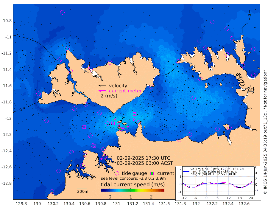 92cm/s 77T +4cm/s rms + 6cm/s 51T. Darwin_C1 52m 72cm/s 91T +4cm/s rms + 7cm/s -161T. Darwin_CW1 22m 33cm/s 73T +4cm/s rms + 8cm/s 61T. Darwin_CW2 34m 46cm/s 47T +3cm/s rms + 9cm/s 98T. Darwin_CW3 22m 45cm/s 90T +5cm/s rms + 7cm/s 88T. Darwin_C3 56m 58cm/s 66T +2cm/s rms + 9cm/s -126T. Darwin_CTbW 22m 16cm/s 85T +1cm/s rms + 1cm/s -47T. DARBGF 30m 13cm/s 111T +4cm/s rms + 3cm/s 80T. NRSDAR 19m 13cm Goodrich Bank 75cm Point Jenny 72cm Native Point 70cm Fish Reef 74cm Tapa Bay 50cm Point Fawcett (Offshore) 68cm Burge Point 55cm Munkunuwa 70cm Beagle A 55cm Parsons Bank 76cm Fenton Patches 66cm Hancox Shoal Area 80cm Nightcliff 66cm Darwin 68cm Charles Point Patches 61cm Glyde Point 66cm Chambers Bay 57cm Point Stuart 51cm Cape Hotham 64cm Christine Reef 64cm West Alligator Head 65cm East Field Island 49cm Two Hills Bay 50cm Camp Point 65cm Medina Inlet South 30cm South Barlow Point 32cm St. Asaph Bay 12cm Cape Van Dieman 8cm Snake Bay 18cm Cache Point 19cm Point Jahleel (Off) 30cm Cape Don 11cm Port Essington 16cm Smith Point - West 9cm NW Peacock Island 12cm North Of Jones Shoal 3cm Peacock Island -3cm Point David 9cm D'urville Point -2cm Copeland Island 2cm One Tree Point