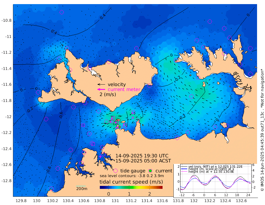 101cm/s -101T +4cm/s rms + 6cm/s 51T. Darwin_C1 52m 49cm/s -89T +4cm/s rms + 7cm/s -161T. Darwin_CW1 22m 51cm/s -107T +4cm/s rms + 8cm/s 61T. Darwin_CW2 34m 38cm/s -130T +3cm/s rms + 9cm/s 98T. Darwin_CW3 22m 70cm/s -91T +5cm/s rms + 7cm/s 88T. Darwin_C3 56m 60cm/s -115T +2cm/s rms + 9cm/s -126T. Darwin_CTbW 22m 10cm/s -101T +1cm/s rms + 1cm/s -47T. DARBGF 30m 10cm/s -98T +4cm/s rms + 3cm/s 80T. NRSDAR 19m 54cm Goodrich Bank -28cm Point Jenny -28cm Native Point -40cm Fish Reef -43cm Tapa Bay 17cm Point Fawcett (Offshore) -48cm Burge Point -58cm Munkunuwa -6cm Beagle A -72cm Parsons Bank -40cm Fenton Patches -62cm Hancox Shoal Area -55cm Nightcliff -66cm Darwin -41cm Charles Point Patches -43cm Glyde Point -30cm Chambers Bay -40cm Point Stuart -40cm Cape Hotham -23cm Christine Reef -46cm West Alligator Head -32cm East Field Island -34cm Two Hills Bay -12cm Camp Point -46cm Medina Inlet South 16cm South Barlow Point 38cm St. Asaph Bay 50cm Cape Van Dieman 44cm Snake Bay 50cm Cache Point 33cm Point Jahleel (Off) 1cm Cape Don 20cm Port Essington 17cm Smith Point - West 18cm NW Peacock Island 37cm North Of Jones Shoal 10cm Peacock Island -7cm Point David 11cm D'urville Point -11cm Copeland Island 0cm One Tree Point