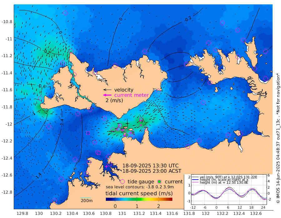 87cm/s -101T +4cm/s rms + 6cm/s 51T. Darwin_C1 52m 82cm/s -91T +4cm/s rms + 7cm/s -161T. Darwin_CW1 22m 48cm/s -106T +4cm/s rms + 8cm/s 61T. Darwin_CW2 34m 60cm/s -139T +3cm/s rms + 9cm/s 98T. Darwin_CW3 22m 81cm/s -90T +5cm/s rms + 7cm/s 88T. Darwin_C3 56m 45cm/s -115T +2cm/s rms + 9cm/s -126T. Darwin_CTbW 22m 7cm/s -136T +1cm/s rms + 1cm/s -47T. DARBGF 30m 4cm/s -157T +4cm/s rms + 3cm/s 80T. NRSDAR 19m 5cm Goodrich Bank -135cm Point Jenny -132cm Native Point -144cm Fish Reef -152cm Tapa Bay -64cm Point Fawcett (Offshore) -172cm Burge Point -130cm Munkunuwa -114cm Beagle A -157cm Parsons Bank -159cm Fenton Patches -160cm Hancox Shoal Area -165cm Nightcliff -180cm Darwin -164cm Charles Point Patches -150cm Glyde Point -144cm Chambers Bay -143cm Point Stuart -137cm Cape Hotham -127cm Christine Reef -152cm West Alligator Head -153cm East Field Island -118cm Two Hills Bay -125cm Camp Point -144cm Medina Inlet South -42cm South Barlow Point -24cm St. Asaph Bay 1cm Cape Van Dieman -1cm Snake Bay -6cm Cache Point -19cm Point Jahleel (Off) -65cm Cape Don -29cm Port Essington -23cm Smith Point - West -23cm NW Peacock Island -11cm North Of Jones Shoal -6cm Peacock Island -50cm Point David -27cm D'urville Point -51cm Copeland Island -47cm One Tree Point