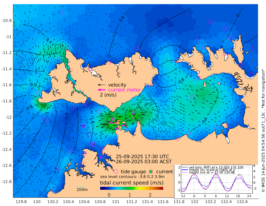 135cm/s -101T +4cm/s rms + 6cm/s 51T. Darwin_C1 52m 113cm/s -91T +4cm/s rms + 7cm/s -161T. Darwin_CW1 22m 85cm/s -106T +4cm/s rms + 8cm/s 61T. Darwin_CW2 34m 67cm/s -135T +3cm/s rms + 9cm/s 98T. Darwin_CW3 22m 144cm/s -91T +5cm/s rms + 7cm/s 88T. Darwin_C3 56m 73cm/s -115T +2cm/s rms + 9cm/s -126T. Darwin_CTbW 22m 9cm/s -131T +1cm/s rms + 1cm/s -47T. DARBGF 30m 11cm/s -148T +4cm/s rms + 3cm/s 80T. NRSDAR 19m 57cm Goodrich Bank -95cm Point Jenny -93cm Native Point -111cm Fish Reef -125cm Tapa Bay -12cm Point Fawcett (Offshore) -133cm Burge Point -124cm Munkunuwa -59cm Beagle A -152cm Parsons Bank -122cm Fenton Patches -151cm Hancox Shoal Area -149cm Nightcliff -172cm Darwin -141cm Charles Point Patches -124cm Glyde Point -111cm Chambers Bay -109cm Point Stuart -106cm Cape Hotham -92cm Christine Reef -121cm West Alligator Head -111cm East Field Island -89cm Two Hills Bay -82cm Camp Point -127cm Medina Inlet South -5cm South Barlow Point 25cm St. Asaph Bay 55cm Cape Van Dieman 46cm Snake Bay 53cm Cache Point 28cm Point Jahleel (Off) -27cm Cape Don 11cm Port Essington 12cm Smith Point - West 15cm NW Peacock Island 33cm North Of Jones Shoal 9cm Peacock Island -15cm Point David 7cm D'urville Point -20cm Copeland Island -12cm One Tree Point