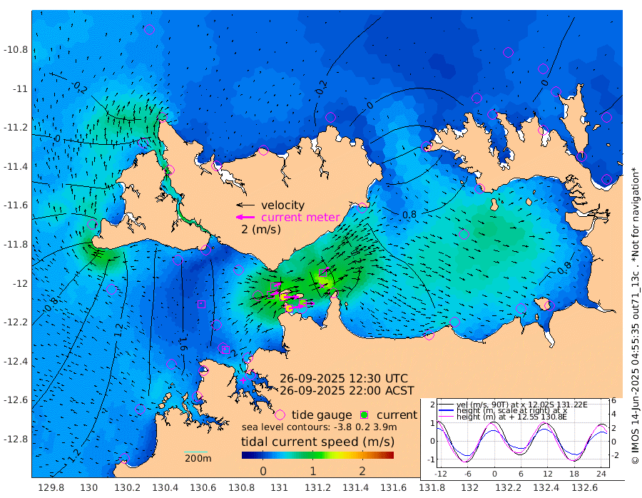 159cm/s 79T +4cm/s rms + 6cm/s 51T. Darwin_C1 52m 127cm/s 93T +4cm/s rms + 7cm/s -161T. Darwin_CW1 22m 93cm/s 71T +4cm/s rms + 8cm/s 61T. Darwin_CW2 34m 89cm/s 47T +3cm/s rms + 9cm/s 98T. Darwin_CW3 22m 159cm/s 89T +5cm/s rms + 7cm/s 88T. Darwin_C3 56m 80cm/s 66T +2cm/s rms + 9cm/s -126T. Darwin_CTbW 22m 9cm/s -24T +1cm/s rms + 1cm/s -47T. DARBGF 30m 24cm/s -37T +4cm/s rms + 3cm/s 80T. NRSDAR 19m -32cm Goodrich Bank 113cm Point Jenny 110cm Native Point 127cm Fish Reef 142cm Tapa Bay 40cm Point Fawcett (Offshore) 144cm Burge Point 126cm Munkunuwa 80cm Beagle A 156cm Parsons Bank 136cm Fenton Patches 166cm Hancox Shoal Area 167cm Nightcliff 183cm Darwin 156cm Charles Point Patches 152cm Glyde Point 159cm Chambers Bay 163cm Point Stuart 144cm Cape Hotham 141cm Christine Reef 182cm West Alligator Head 182cm East Field Island 134cm Two Hills Bay 121cm Camp Point 139cm Medina Inlet South 20cm South Barlow Point 0cm St. Asaph Bay -32cm Cape Van Dieman -24cm Snake Bay -23cm Cache Point 1cm Point Jahleel (Off) 51cm Cape Don 6cm Port Essington 7cm Smith Point - West 3cm NW Peacock Island -7cm North Of Jones Shoal -1cm Peacock Island 25cm Point David 8cm D'urville Point 29cm Copeland Island 25cm One Tree Point