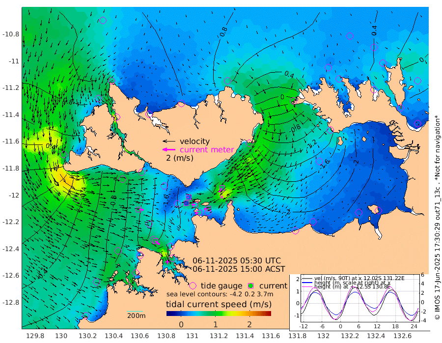 64cm/s -101T +4cm/s rms + 6cm/s 51T. Darwin_C1 52m 73cm/s -93T +4cm/s rms + 7cm/s -161T. Darwin_CW1 22m 5cm/s -94T +4cm/s rms + 8cm/s 61T. Darwin_CW2 34m 84cm/s -141T +3cm/s rms + 9cm/s 98T. Darwin_CW3 22m 55cm/s -88T +5cm/s rms + 7cm/s 88T. Darwin_C3 56m 15cm/s -115T +2cm/s rms + 9cm/s -126T. Darwin_CTbW 22m 79cm/s 97T +1cm/s rms + 1cm/s -47T. DARBGF 30m 89cm/s 127T +4cm/s rms + 3cm/s 80T. NRSDAR 19m 78cm Goodrich Bank -10cm Point Jenny -9cm Native Point -22cm Fish Reef -37cm Tapa Bay 68cm Point Fawcett (Offshore) -63cm Burge Point -3cm Munkunuwa 8cm Beagle A -66cm Parsons Bank -60cm Fenton Patches -91cm Hancox Shoal Area -79cm Nightcliff -103cm Darwin -65cm Charles Point Patches -144cm Glyde Point -212cm Chambers Bay -240cm Point Stuart -157cm Cape Hotham -197cm Christine Reef -270cm West Alligator Head -313cm East Field Island -167cm Two Hills Bay -170cm Camp Point -33cm Medina Inlet South 71cm South Barlow Point 86cm St. Asaph Bay 85cm Cape Van Dieman 76cm Snake Bay 72cm Cache Point 40cm Point Jahleel (Off) -27cm Cape Don 30cm Port Essington 36cm Smith Point - West 26cm NW Peacock Island 49cm North Of Jones Shoal 15cm Peacock Island -19cm Point David 26cm D'urville Point -25cm Copeland Island -13cm One Tree Point