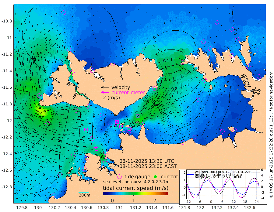 50cm/s 80T +4cm/s rms + 6cm/s 51T. Darwin_C1 52m 65cm/s 89T +4cm/s rms + 7cm/s -161T. Darwin_CW1 22m 11cm/s 72T +4cm/s rms + 8cm/s 61T. Darwin_CW2 34m 54cm/s 41T +3cm/s rms + 9cm/s 98T. Darwin_CW3 22m 50cm/s 94T +5cm/s rms + 7cm/s 88T. Darwin_C3 56m 23cm/s 70T +2cm/s rms + 9cm/s -126T. Darwin_CTbW 22m 56cm/s -82T +1cm/s rms + 1cm/s -47T. DARBGF 30m 71cm/s -53T +4cm/s rms + 3cm/s 80T. NRSDAR 19m -39cm Goodrich Bank 30cm Point Jenny 26cm Native Point 29cm Fish Reef 40cm Tapa Bay -22cm Point Fawcett (Offshore) 58cm Burge Point 8cm Munkunuwa 14cm Beagle A 46cm Parsons Bank 53cm Fenton Patches 71cm Hancox Shoal Area 70cm Nightcliff 73cm Darwin 51cm Charles Point Patches 115cm Glyde Point 192cm Chambers Bay 206cm Point Stuart 130cm Cape Hotham 185cm Christine Reef 234cm West Alligator Head 271cm East Field Island 146cm Two Hills Bay 144cm Camp Point 32cm Medina Inlet South -41cm South Barlow Point -40cm St. Asaph Bay -47cm Cape Van Dieman -47cm Snake Bay -31cm Cache Point -13cm Point Jahleel (Off) 33cm Cape Don -18cm Port Essington -20cm Smith Point - West -18cm NW Peacock Island -22cm North Of Jones Shoal -8cm Peacock Island -6cm Point David -22cm D'urville Point -2cm Copeland Island -2cm One Tree Point