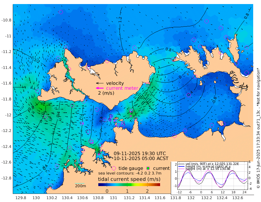 56cm/s -101T +4cm/s rms + 6cm/s 51T. Darwin_C1 52m 44cm/s -91T +4cm/s rms + 7cm/s -161T. Darwin_CW1 22m 12cm/s -111T +4cm/s rms + 8cm/s 61T. Darwin_CW2 34m 56cm/s -137T +3cm/s rms + 9cm/s 98T. Darwin_CW3 22m 37cm/s -90T +5cm/s rms + 7cm/s 88T. Darwin_C3 56m 20cm/s -115T +2cm/s rms + 9cm/s -126T. Darwin_CTbW 22m 42cm/s 97T +1cm/s rms + 1cm/s -47T. DARBGF 30m 44cm/s 131T +4cm/s rms + 3cm/s 80T. NRSDAR 19m 109cm Goodrich Bank 29cm Point Jenny 32cm Native Point 23cm Fish Reef 17cm Tapa Bay 89cm Point Fawcett (Offshore) 5cm Burge Point 17cm Munkunuwa 48cm Beagle A -5cm Parsons Bank 5cm Fenton Patches -17cm Hancox Shoal Area -12cm Nightcliff -8cm Darwin 26cm Charles Point Patches -42cm Glyde Point -102cm Chambers Bay -118cm Point Stuart -58cm Cape Hotham -91cm Christine Reef -142cm West Alligator Head -162cm East Field Island -67cm Two Hills Bay -51cm Camp Point 23cm Medina Inlet South 97cm South Barlow Point 104cm St. Asaph Bay 112cm Cape Van Dieman 113cm Snake Bay 104cm Cache Point 79cm Point Jahleel (Off) 36cm Cape Don 81cm Port Essington 77cm Smith Point - West 77cm NW Peacock Island 92cm North Of Jones Shoal 31cm Peacock Island 55cm Point David 76cm D'urville Point 47cm Copeland Island 60cm One Tree Point