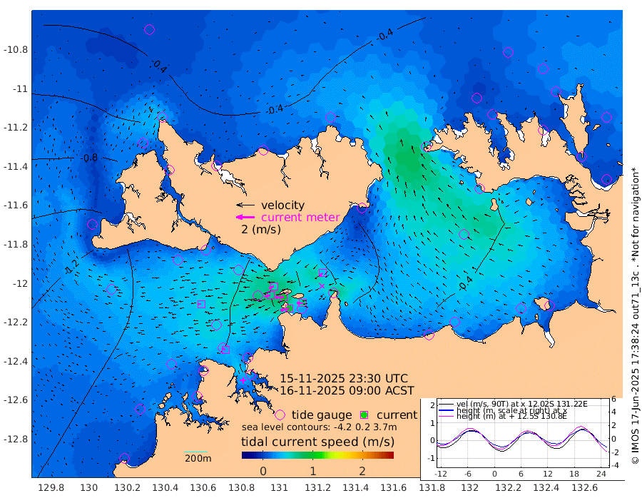 95cm/s -102T +4cm/s rms + 6cm/s 51T. Darwin_C1 52m 65cm/s -89T +4cm/s rms + 7cm/s -161T. Darwin_CW1 22m 67cm/s -107T +4cm/s rms + 8cm/s 61T. Darwin_CW2 34m 41cm/s -133T +3cm/s rms + 9cm/s 98T. Darwin_CW3 22m 93cm/s -91T +5cm/s rms + 7cm/s 88T. Darwin_C3 56m 57cm/s -115T +2cm/s rms + 9cm/s -126T. Darwin_CTbW 22m 40cm/s -94T +1cm/s rms + 1cm/s -47T. DARBGF 30m 34cm/s -63T +4cm/s rms + 3cm/s 80T. NRSDAR 19m -26cm Goodrich Bank -153cm Point Jenny -149cm Native Point -169cm Fish Reef -159cm Tapa Bay -104cm Point Fawcett (Offshore) -173cm Burge Point -149cm Munkunuwa -149cm Beagle A -160cm Parsons Bank -174cm Fenton Patches -153cm Hancox Shoal Area -172cm Nightcliff -174cm Darwin -164cm Charles Point Patches -125cm Glyde Point -92cm Chambers Bay -84cm Point Stuart -107cm Cape Hotham -82cm Christine Reef -86cm West Alligator Head -72cm East Field Island -87cm Two Hills Bay -77cm Camp Point -160cm Medina Inlet South -84cm South Barlow Point -66cm St. Asaph Bay -31cm Cape Van Dieman -33cm Snake Bay -38cm Cache Point -44cm Point Jahleel (Off) -69cm Cape Don -46cm Port Essington -50cm Smith Point - West -43cm NW Peacock Island -38cm North Of Jones Shoal -14cm Peacock Island -41cm Point David -48cm D'urville Point -43cm Copeland Island -46cm One Tree Point