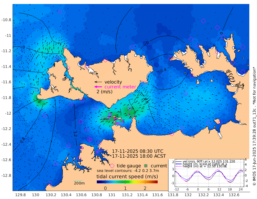 83cm/s 80T +4cm/s rms + 6cm/s 51T. Darwin_C1 52m 80cm/s 92T +4cm/s rms + 7cm/s -161T. Darwin_CW1 22m 57cm/s 72T +4cm/s rms + 8cm/s 61T. Darwin_CW2 34m 50cm/s 43T +3cm/s rms + 9cm/s 98T. Darwin_CW3 22m 97cm/s 90T +5cm/s rms + 7cm/s 88T. Darwin_C3 56m 37cm/s 66T +2cm/s rms + 9cm/s -126T. Darwin_CTbW 22m 7cm/s 14T +1cm/s rms + 1cm/s -47T. DARBGF 30m 10cm/s -38T +4cm/s rms + 3cm/s 80T. NRSDAR 19m -24cm Goodrich Bank 108cm Point Jenny 104cm Native Point 125cm Fish Reef 126cm Tapa Bay 46cm Point Fawcett (Offshore) 144cm Burge Point 116cm Munkunuwa 90cm Beagle A 136cm Parsons Bank 135cm Fenton Patches 140cm Hancox Shoal Area 146cm Nightcliff 157cm Darwin 137cm Charles Point Patches 131cm Glyde Point 131cm Chambers Bay 136cm Point Stuart 126cm Cape Hotham 115cm Christine Reef 150cm West Alligator Head 152cm East Field Island 110cm Two Hills Bay 103cm Camp Point 124cm Medina Inlet South 22cm South Barlow Point 8cm St. Asaph Bay -23cm Cape Van Dieman -21cm Snake Bay -13cm Cache Point 3cm Point Jahleel (Off) 42cm Cape Don 4cm Port Essington 3cm Smith Point - West 0cm NW Peacock Island -6cm North Of Jones Shoal -1cm Peacock Island 15cm Point David 2cm D'urville Point 19cm Copeland Island 16cm One Tree Point