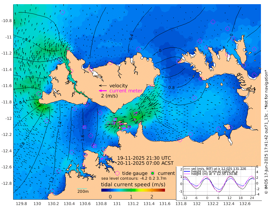114cm/s 79T +4cm/s rms + 6cm/s 51T. Darwin_C1 52m 105cm/s 92T +4cm/s rms + 7cm/s -161T. Darwin_CW1 22m 60cm/s 71T +4cm/s rms + 8cm/s 61T. Darwin_CW2 34m 76cm/s 44T +3cm/s rms + 9cm/s 98T. Darwin_CW3 22m 110cm/s 90T +5cm/s rms + 7cm/s 88T. Darwin_C3 56m 49cm/s 65T +2cm/s rms + 9cm/s -126T. Darwin_CTbW 22m 18cm/s -69T +1cm/s rms + 1cm/s -47T. DARBGF 30m 29cm/s -46T +4cm/s rms + 3cm/s 80T. NRSDAR 19m -65cm Goodrich Bank 60cm Point Jenny 58cm Native Point 85cm Fish Reef 85cm Tapa Bay -13cm Point Fawcett (Offshore) 109cm Burge Point 80cm Munkunuwa 36cm Beagle A 118cm Parsons Bank 96cm Fenton Patches 116cm Hancox Shoal Area 112cm Nightcliff 143cm Darwin 111cm Charles Point Patches 122cm Glyde Point 120cm Chambers Bay 138cm Point Stuart 114cm Cape Hotham 103cm Christine Reef 151cm West Alligator Head 156cm East Field Island 104cm Two Hills Bay 99cm Camp Point 94cm Medina Inlet South -17cm South Barlow Point -46cm St. Asaph Bay -64cm Cape Van Dieman -54cm Snake Bay -58cm Cache Point -34cm Point Jahleel (Off) 27cm Cape Don -12cm Port Essington -19cm Smith Point - West -16cm NW Peacock Island -34cm North Of Jones Shoal -8cm Peacock Island 23cm Point David -10cm D'urville Point 29cm Copeland Island 21cm One Tree Point