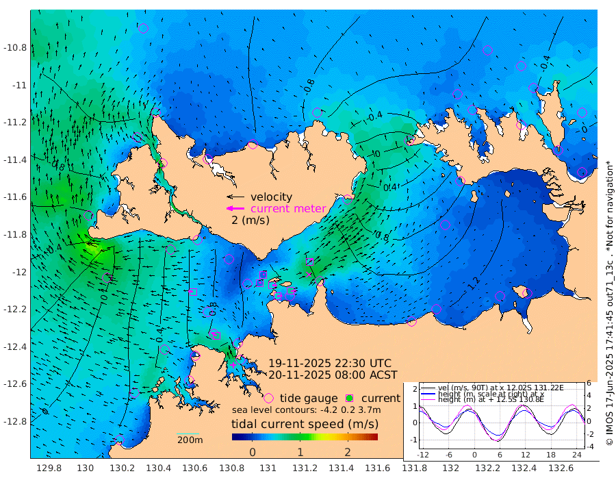 53cm/s 81T +4cm/s rms + 6cm/s 51T. Darwin_C1 52m 64cm/s 91T +4cm/s rms + 7cm/s -161T. Darwin_CW1 22m 19cm/s 63T +4cm/s rms + 8cm/s 61T. Darwin_CW2 34m 51cm/s 44T +3cm/s rms + 9cm/s 98T. Darwin_CW3 22m 49cm/s 91T +5cm/s rms + 7cm/s 88T. Darwin_C3 56m 15cm/s 65T +2cm/s rms + 9cm/s -126T. Darwin_CTbW 22m 50cm/s -83T +1cm/s rms + 1cm/s -47T. DARBGF 30m 64cm/s -54T +4cm/s rms + 3cm/s 80T. NRSDAR 19m -99cm Goodrich Bank -30cm Point Jenny -33cm Native Point -8cm Fish Reef -11cm Tapa Bay -84cm Point Fawcett (Offshore) 12cm Burge Point -13cm Munkunuwa -50cm Beagle A 26cm Parsons Bank 1cm Fenton Patches 30cm Hancox Shoal Area 14cm Nightcliff 45cm Darwin 13cm Charles Point Patches 67cm Glyde Point 106cm Chambers Bay 135cm Point Stuart 77cm Cape Hotham 89cm Christine Reef 153cm West Alligator Head 176cm East Field Island 84cm Two Hills Bay 76cm Camp Point -2cm Medina Inlet South -84cm South Barlow Point -102cm St. Asaph Bay -102cm Cape Van Dieman -95cm Snake Bay -94cm Cache Point -69cm Point Jahleel (Off) -11cm Cape Don -49cm Port Essington -57cm Smith Point - West -51cm NW Peacock Island -69cm North Of Jones Shoal -21cm Peacock Island -11cm Point David -48cm D'urville Point -4cm Copeland Island -14cm One Tree Point