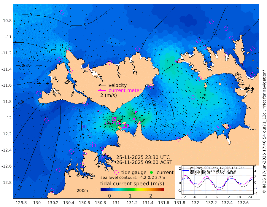 149cm/s 78T +4cm/s rms + 6cm/s 51T. Darwin_C1 52m 88cm/s 89T +4cm/s rms + 7cm/s -161T. Darwin_CW1 22m 48cm/s 75T +4cm/s rms + 8cm/s 61T. Darwin_CW2 34m 81cm/s 45T +3cm/s rms + 9cm/s 98T. Darwin_CW3 22m 70cm/s 89T +5cm/s rms + 7cm/s 88T. Darwin_C3 56m 76cm/s 64T +2cm/s rms + 9cm/s -126T. Darwin_CTbW 22m 13cm/s 82T +1cm/s rms + 1cm/s -47T. DARBGF 30m 13cm/s 89T +4cm/s rms + 3cm/s 80T. NRSDAR 19m -11cm Goodrich Bank 84cm Point Jenny 85cm Native Point 84cm Fish Reef 108cm Tapa Bay 28cm Point Fawcett (Offshore) 105cm Burge Point 98cm Munkunuwa 58cm Beagle A 125cm Parsons Bank 97cm Fenton Patches 124cm Hancox Shoal Area 119cm Nightcliff 130cm Darwin 114cm Charles Point Patches 88cm Glyde Point 55cm Chambers Bay 54cm Point Stuart 74cm Cape Hotham 51cm Christine Reef 53cm West Alligator Head 36cm East Field Island 55cm Two Hills Bay 56cm Camp Point 99cm Medina Inlet South 31cm South Barlow Point 7cm St. Asaph Bay -6cm Cape Van Dieman 4cm Snake Bay -7cm Cache Point 8cm Point Jahleel (Off) 40cm Cape Don 26cm Port Essington 26cm Smith Point - West 30cm NW Peacock Island 8cm North Of Jones Shoal 6cm Peacock Island 69cm Point David 38cm D'urville Point 71cm Copeland Island 56cm One Tree Point