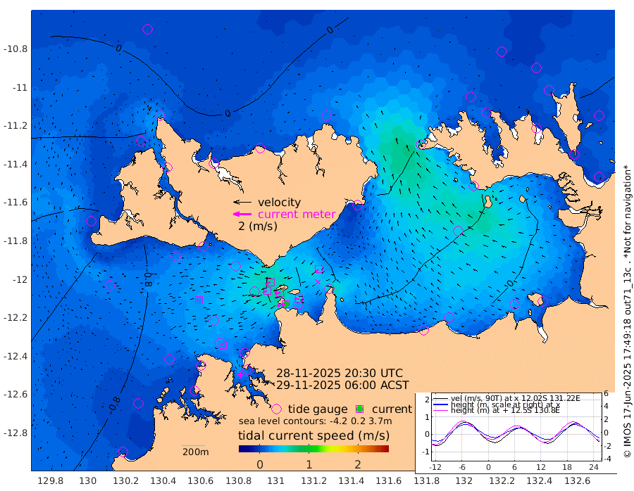 98cm/s -101T +4cm/s rms + 6cm/s 51T. Darwin_C1 52m 47cm/s -90T +4cm/s rms + 7cm/s -161T. Darwin_CW1 22m 47cm/s -107T +4cm/s rms + 8cm/s 61T. Darwin_CW2 34m 42cm/s -133T +3cm/s rms + 9cm/s 98T. Darwin_CW3 22m 60cm/s -91T +5cm/s rms + 7cm/s 88T. Darwin_C3 56m 59cm/s -115T +2cm/s rms + 9cm/s -126T. Darwin_CTbW 22m 25cm/s -93T +1cm/s rms + 1cm/s -47T. DARBGF 30m 23cm/s -67T +4cm/s rms + 3cm/s 80T. NRSDAR 19m 6cm Goodrich Bank -87cm Point Jenny -86cm Native Point -88cm Fish Reef -97cm Tapa Bay -41cm Point Fawcett (Offshore) -98cm Burge Point -92cm Munkunuwa -79cm Beagle A -102cm Parsons Bank -102cm Fenton Patches -102cm Hancox Shoal Area -114cm Nightcliff -99cm Darwin -84cm Charles Point Patches -69cm Glyde Point -55cm Chambers Bay -45cm Point Stuart -62cm Cape Hotham -52cm Christine Reef -48cm West Alligator Head -34cm East Field Island -47cm Two Hills Bay -37cm Camp Point -87cm Medina Inlet South -34cm South Barlow Point -20cm St. Asaph Bay 2cm Cape Van Dieman -1cm Snake Bay -1cm Cache Point -12cm Point Jahleel (Off) -27cm Cape Don -9cm Port Essington -19cm Smith Point - West -15cm NW Peacock Island -3cm North Of Jones Shoal -2cm Peacock Island -24cm Point David -20cm D'urville Point -26cm Copeland Island -19cm One Tree Point
