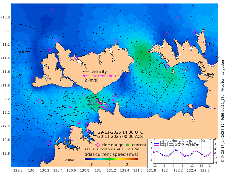 115cm/s 78T +4cm/s rms + 6cm/s 51T. Darwin_C1 52m 64cm/s 92T +4cm/s rms + 7cm/s -161T. Darwin_CW1 22m 63cm/s 73T +4cm/s rms + 8cm/s 61T. Darwin_CW2 34m 49cm/s 50T +3cm/s rms + 9cm/s 98T. Darwin_CW3 22m 85cm/s 89T +5cm/s rms + 7cm/s 88T. Darwin_C3 56m 68cm/s 65T +2cm/s rms + 9cm/s -126T. Darwin_CTbW 22m 36cm/s 87T +1cm/s rms + 1cm/s -47T. DARBGF 30m 34cm/s 115T +4cm/s rms + 3cm/s 80T. NRSDAR 19m 37cm Goodrich Bank 128cm Point Jenny 130cm Native Point 130cm Fish Reef 133cm Tapa Bay 88cm Point Fawcett (Offshore) 145cm Burge Point 135cm Munkunuwa 124cm Beagle A 137cm Parsons Bank 141cm Fenton Patches 124cm Hancox Shoal Area 142cm Nightcliff 138cm Darwin 127cm Charles Point Patches 87cm Glyde Point 42cm Chambers Bay 33cm Point Stuart 66cm Cape Hotham 48cm Christine Reef 32cm West Alligator Head 10cm East Field Island 49cm Two Hills Bay 43cm Camp Point 133cm Medina Inlet South 85cm South Barlow Point 65cm St. Asaph Bay 42cm Cape Van Dieman 47cm Snake Bay 41cm Cache Point 44cm Point Jahleel (Off) 55cm Cape Don 41cm Port Essington 46cm Smith Point - West 41cm NW Peacock Island 34cm North Of Jones Shoal 12cm Peacock Island 36cm Point David 45cm D'urville Point 34cm Copeland Island 37cm One Tree Point