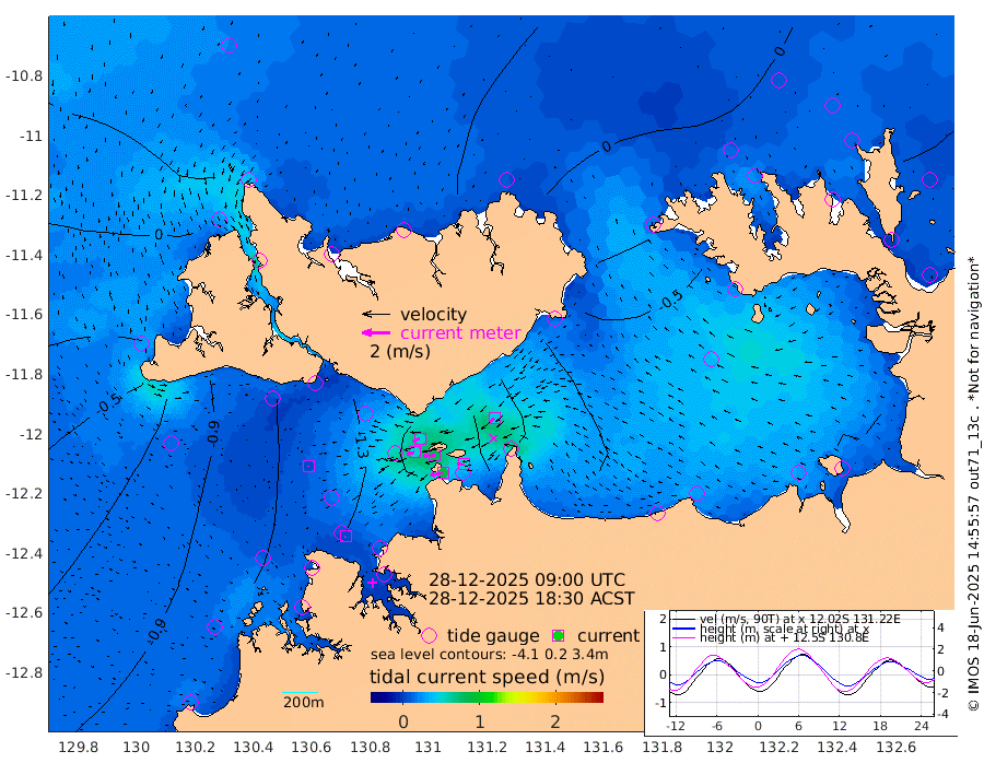 90cm/s -101T +4cm/s rms + 6cm/s 51T. Darwin_C1 52m 50cm/s -89T +4cm/s rms + 7cm/s -161T. Darwin_CW1 22m 53cm/s -107T +4cm/s rms + 8cm/s 61T. Darwin_CW2 34m 47cm/s -132T +3cm/s rms + 9cm/s 98T. Darwin_CW3 22m 83cm/s -91T +5cm/s rms + 7cm/s 88T. Darwin_C3 56m 53cm/s -115T +2cm/s rms + 9cm/s -126T. Darwin_CTbW 22m 4cm/s -148T +1cm/s rms + 1cm/s -47T. DARBGF 30m 7cm/s -173T +4cm/s rms + 3cm/s 80T. NRSDAR 19m 36cm Goodrich Bank -76cm Point Jenny -75cm Native Point -75cm Fish Reef -90cm Tapa Bay -10cm Point Fawcett (Offshore) -99cm Burge Point -85cm Munkunuwa -46cm Beagle A -108cm Parsons Bank -86cm Fenton Patches -106cm Hancox Shoal Area -106cm Nightcliff -113cm Darwin -92cm Charles Point Patches -88cm Glyde Point -87cm Chambers Bay -83cm Point Stuart -77cm Cape Hotham -80cm Christine Reef -91cm West Alligator Head -82cm East Field Island -69cm Two Hills Bay -65cm Camp Point -85cm Medina Inlet South -5cm South Barlow Point 17cm St. Asaph Bay 33cm Cape Van Dieman 29cm Snake Bay 30cm Cache Point 15cm Point Jahleel (Off) -29cm Cape Don 1cm Port Essington 1cm Smith Point - West 1cm NW Peacock Island 18cm North Of Jones Shoal 4cm Peacock Island -27cm Point David -5cm D'urville Point -30cm Copeland Island -21cm One Tree Point