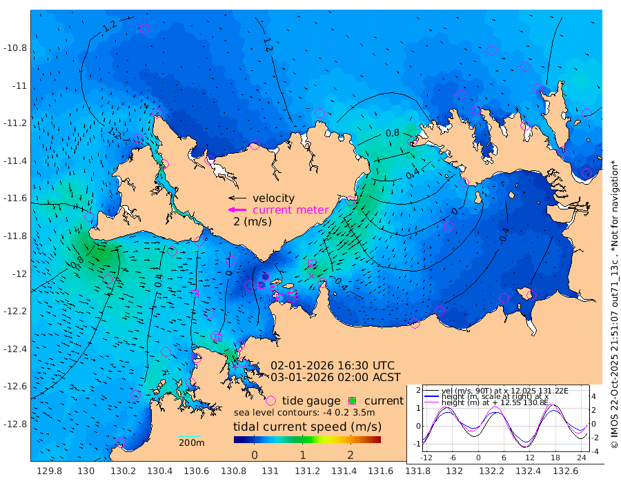 37cm/s -101T +4cm/s rms + 6cm/s 51T. Darwin_C1 52m 58cm/s -90T +4cm/s rms + 7cm/s -161T. Darwin_CW1 22m 12cm/s -112T +4cm/s rms + 8cm/s 61T. Darwin_CW2 34m 50cm/s -138T +3cm/s rms + 9cm/s 98T. Darwin_CW3 22m 36cm/s -91T +5cm/s rms + 7cm/s 88T. Darwin_C3 56m 1cm/s -54T +2cm/s rms + 9cm/s -126T. Darwin_CTbW 22m 36cm/s 98T +1cm/s rms + 1cm/s -47T. DARBGF 30m 37cm/s 131T +4cm/s rms + 3cm/s 80T. NRSDAR 19m 99cm Goodrich Bank 28cm Point Jenny 30cm Native Point 26cm Fish Reef 15cm Tapa Bay 82cm Point Fawcett (Offshore) 3cm Burge Point 11cm Munkunuwa 44cm Beagle A 3cm Parsons Bank 6cm Fenton Patches -10cm Hancox Shoal Area -11cm Nightcliff -5cm Darwin 21cm Charles Point Patches -23cm Glyde Point -65cm Chambers Bay -71cm Point Stuart -31cm Cape Hotham -58cm Christine Reef -90cm West Alligator Head -107cm East Field Island -30cm Two Hills Bay -31cm Camp Point 20cm Medina Inlet South 87cm South Barlow Point 91cm St. Asaph Bay 102cm Cape Van Dieman 106cm Snake Bay 100cm Cache Point 80cm Point Jahleel (Off) 50cm Cape Don 87cm Port Essington 86cm Smith Point - West 87cm NW Peacock Island 93cm North Of Jones Shoal 33cm Peacock Island 74cm Point David 88cm D'urville Point 68cm Copeland Island 77cm One Tree Point