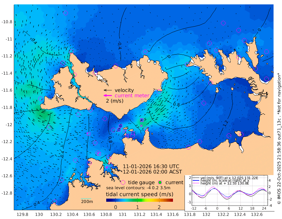 12cm/s 79T +4cm/s rms + 6cm/s 51T. Darwin_C1 52m 9cm/s 87T +4cm/s rms + 7cm/s -161T. Darwin_CW1 22m 9cm/s 74T +4cm/s rms + 8cm/s 61T. Darwin_CW2 34m 19cm/s 41T +3cm/s rms + 9cm/s 98T. Darwin_CW3 22m 32cm/s 93T +5cm/s rms + 7cm/s 88T. Darwin_C3 56m 5cm/s 65T +2cm/s rms + 9cm/s -126T. Darwin_CTbW 22m 31cm/s -82T +1cm/s rms + 1cm/s -47T. DARBGF 30m 37cm/s -52T +4cm/s rms + 3cm/s 80T. NRSDAR 19m -46cm Goodrich Bank 6cm Point Jenny 4cm Native Point 21cm Fish Reef 13cm Tapa Bay -31cm Point Fawcett (Offshore) 30cm Burge Point 0cm Munkunuwa -2cm Beagle A 31cm Parsons Bank 28cm Fenton Patches 35cm Hancox Shoal Area 28cm Nightcliff 47cm Darwin 27cm Charles Point Patches 73cm Glyde Point 110cm Chambers Bay 130cm Point Stuart 80cm Cape Hotham 96cm Christine Reef 146cm West Alligator Head 166cm East Field Island 91cm Two Hills Bay 81cm Camp Point 17cm Medina Inlet South -38cm South Barlow Point -49cm St. Asaph Bay -48cm Cape Van Dieman -45cm Snake Bay -39cm Cache Point -24cm Point Jahleel (Off) 18cm Cape Don -13cm Port Essington -18cm Smith Point - West -15cm NW Peacock Island -28cm North Of Jones Shoal -8cm Peacock Island 7cm Point David -13cm D'urville Point 10cm Copeland Island 7cm One Tree Point