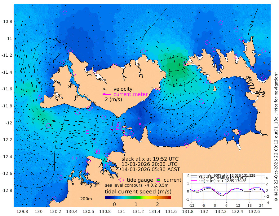 53cm/s -103T +4cm/s rms + 6cm/s 51T. Darwin_C1 52m 19cm/s -92T +4cm/s rms + 7cm/s -161T. Darwin_CW1 22m 40cm/s -105T +4cm/s rms + 8cm/s 61T. Darwin_CW2 34m 11cm/s -110T +3cm/s rms + 9cm/s 98T. Darwin_CW3 22m 49cm/s -92T +5cm/s rms + 7cm/s 88T. Darwin_C3 56m 40cm/s -115T +2cm/s rms + 9cm/s -126T. Darwin_CTbW 22m 40cm/s -90T +1cm/s rms + 1cm/s -47T. DARBGF 30m 39cm/s -61T +4cm/s rms + 3cm/s 80T. NRSDAR 19m -67cm Goodrich Bank -83cm Point Jenny -85cm Native Point -73cm Fish Reef -85cm Tapa Bay -89cm Point Fawcett (Offshore) -70cm Burge Point -83cm Munkunuwa -82cm Beagle A -70cm Parsons Bank -72cm Fenton Patches -68cm Hancox Shoal Area -82cm Nightcliff -67cm Darwin -77cm Charles Point Patches -25cm Glyde Point 10cm Chambers Bay 35cm Point Stuart -10cm Cape Hotham 5cm Christine Reef 42cm West Alligator Head 64cm East Field Island 3cm Two Hills Bay 3cm Camp Point -80cm Medina Inlet South -86cm South Barlow Point -85cm St. Asaph Bay -70cm Cape Van Dieman -72cm Snake Bay -67cm Cache Point -60cm Point Jahleel (Off) -39cm Cape Don -49cm Port Essington -57cm Smith Point - West -51cm NW Peacock Island -59cm North Of Jones Shoal -19cm Peacock Island -33cm Point David -52cm D'urville Point -29cm Copeland Island -35cm One Tree Point
