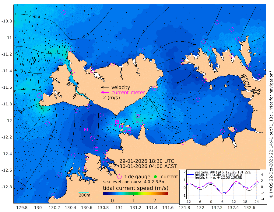 65cm/s 78T +4cm/s rms + 6cm/s 51T. Darwin_C1 52m 51cm/s 89T +4cm/s rms + 7cm/s -161T. Darwin_CW1 22m 19cm/s 72T +4cm/s rms + 8cm/s 61T. Darwin_CW2 34m 46cm/s 39T +3cm/s rms + 9cm/s 98T. Darwin_CW3 22m 32cm/s 91T +5cm/s rms + 7cm/s 88T. Darwin_C3 56m 33cm/s 64T +2cm/s rms + 9cm/s -126T. Darwin_CTbW 22m 12cm/s -80T +1cm/s rms + 1cm/s -47T. DARBGF 30m 12cm/s -44T +4cm/s rms + 3cm/s 80T. NRSDAR 19m -48cm Goodrich Bank 44cm Point Jenny 44cm Native Point 52cm Fish Reef 57cm Tapa Bay -17cm Point Fawcett (Offshore) 71cm Burge Point 41cm Munkunuwa 32cm Beagle A 74cm Parsons Bank 71cm Fenton Patches 77cm Hancox Shoal Area 73cm Nightcliff 82cm Darwin 60cm Charles Point Patches 84cm Glyde Point 89cm Chambers Bay 105cm Point Stuart 84cm Cape Hotham 82cm Christine Reef 113cm West Alligator Head 120cm East Field Island 77cm Two Hills Bay 76cm Camp Point 48cm Medina Inlet South -22cm South Barlow Point -40cm St. Asaph Bay -45cm Cape Van Dieman -41cm Snake Bay -40cm Cache Point -22cm Point Jahleel (Off) 20cm Cape Don -8cm Port Essington -9cm Smith Point - West -4cm NW Peacock Island -29cm North Of Jones Shoal -7cm Peacock Island 35cm Point David 2cm D'urville Point 39cm Copeland Island 23cm One Tree Point