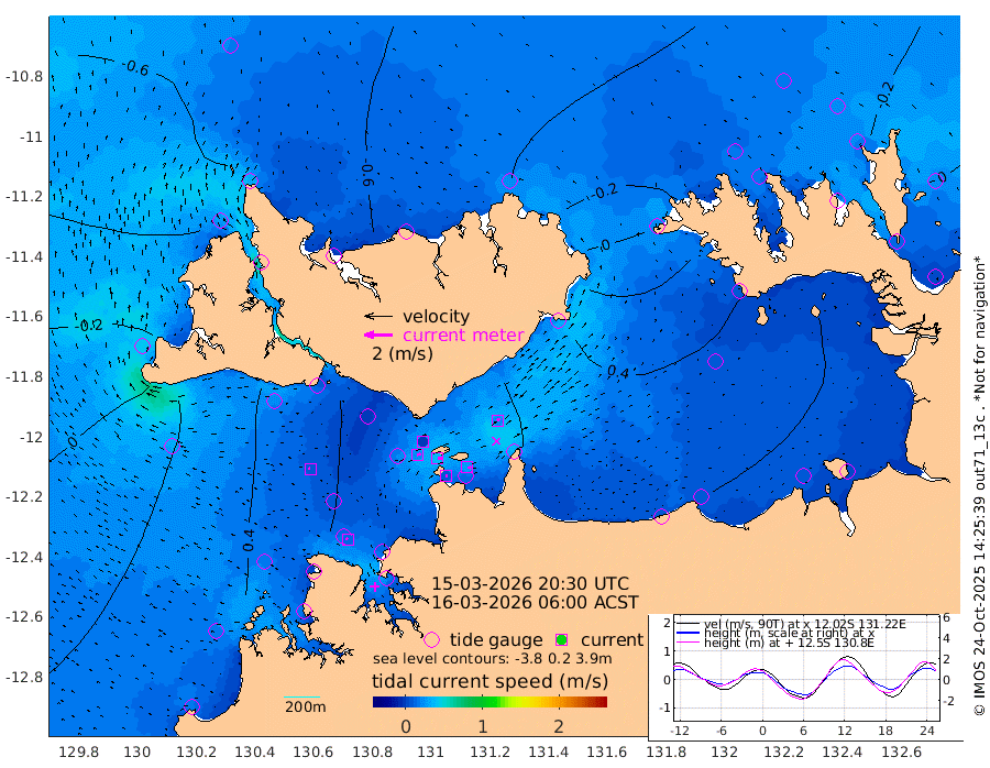 11cm/s 89T +4cm/s rms + 6cm/s 51T. Darwin_C1 52m 26cm/s 93T +4cm/s rms + 7cm/s -161T. Darwin_CW1 22m 25cm/s 66T +4cm/s rms + 8cm/s 61T. Darwin_CW2 34m 21cm/s 32T +3cm/s rms + 9cm/s 98T. Darwin_CW3 22m 37cm/s 88T +5cm/s rms + 7cm/s 88T. Darwin_C3 56m 0cm/s 149T +2cm/s rms + 9cm/s -126T. Darwin_CTbW 22m 10cm/s -75T +1cm/s rms + 1cm/s -47T. DARBGF 30m 15cm/s -55T +4cm/s rms + 3cm/s 80T. NRSDAR 19m -60cm Goodrich Bank 13cm Point Jenny 12cm Native Point 29cm Fish Reef 32cm Tapa Bay -27cm Point Fawcett (Offshore) 39cm Burge Point 26cm Munkunuwa 2cm Beagle A 43cm Parsons Bank 37cm Fenton Patches 51cm Hancox Shoal Area 54cm Nightcliff 60cm Darwin 41cm Charles Point Patches 53cm Glyde Point 66cm Chambers Bay 69cm Point Stuart 56cm Cape Hotham 44cm Christine Reef 77cm West Alligator Head 84cm East Field Island 45cm Two Hills Bay 47cm Camp Point 31cm Medina Inlet South -35cm South Barlow Point -46cm St. Asaph Bay -59cm Cape Van Dieman -54cm Snake Bay -56cm Cache Point -39cm Point Jahleel (Off) -9cm Cape Don -32cm Port Essington -35cm Smith Point - West -33cm NW Peacock Island -39cm North Of Jones Shoal -12cm Peacock Island -4cm Point David -30cm D'urville Point 1cm Copeland Island -9cm One Tree Point