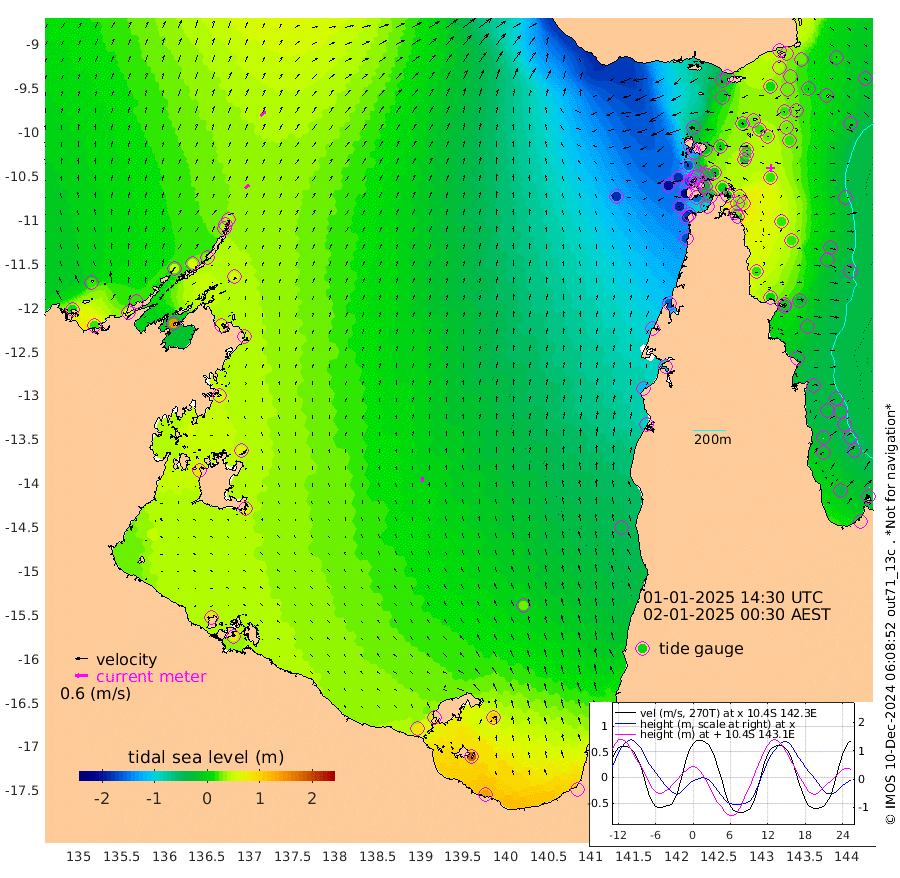 26cm/s 51T +3cm/s rms + 7cm/s -42T. ARA-GOC87 57m 23cm/s -8T +3cm/s rms + 2cm/s -2T. ARA-GOC87 60m 34cm/s 48T +2cm/s rms + 3cm/s 61T. ARA-GOC87 47m 35cm Daru 36cm Bobo Island -14cm Meer Island Barge 8cm Bramble Cay 26cm Unnamed Cay 24cm Pearce Cay 14cm Stephens Island 28cm Merrie England Shoals 38cm Mutacomal Reef 13cm Darnley Island Barge -15cm East Cay 25cm Yorke Island Barge 18cm Rennel Island 26cm Aureed Island 18cm Dungeness Reef 23cm Zagai Island 7cm Yam Island -24cm Dauan Island -11cm Saibai Island -9cm Phipi Reef 15cm Warrior Reef - West -41cm Mabuiag Island Barge 19cm Half Way Island 23cm Coconut Island 19cm Dugong Islet 17cm Poll Island 9cm Kirkcaldie Reef 1cm Suarji Island 22cm Sue Islet -164cm Hawkesbury Island -22cm Alert Patches -15cm Twin Island -134cm Badu Island -12cm St Pauls (Moa Island) -122cm Kubin (Moa Island) -53cm Ince Point -78cm Thursday Island -71cm Nardana Patches -115cm Turtle Head -135cm Round Island -171cm Goods Island -205cm Booby Island -185cm White Rocks Area -187cm Carpentaria -20cm Papou Point -213cm Bampfield Head -174cm Crab Island -193cm Red Wallis Island -150cm Packe Island 26cm Harrington Reef -192cm Herald Camp 10cm Sharp Point -99cm Red Island Point -59cm Possession Island 3cm Alpha Rock 5cm Frederick Point 35cm Wyborn Reef Light 32cm Tetley Island -15cm Triangle Reef 23cm Turtle Head Island -24cm Maclennan Cay -36cm Raine Island 19cm Mcsweeny Reef 15cm Collette Reef -11cm Shadwell Reef 20cm Hannibal Island 4cm Round Point -166cm Vrilya Point -5cm Cape Grenville -13cm Hicks Island -28cm Sir Charles Hardy Island -2cm Harvey Island -16cm Kay Reef -27cm Rocky Island -33cm Chapman Island -35cm Ham Reef -29cm Jubilee Reef -25cm Night Island -36cm Unnamed Reef No. 3 -29cm Morris Island -39cm 1st 3 Mile Opening -34cm Creech Reef -22cm Fife Island -34cm Eden Reef -29cm Stanley Island -22cm Normanby River 13cm Yabooma Island 21cm Hutchison River 19cm Elcho Island 22cm North West Crocodile Island 38cm Cape Wessel 51cm Stevens Island 60cm Guluwuru Island 37cm Hopeful Bay 38cm Auster Point 34cm Two Island Bay 58cm Cadell Strait 149cm Mallison Island 58cm Melville Bay (Gove Harbour) 55cm Truant Island 46cm Cape Arnhem 62cm Cape Grey 66cm Hawk Island 83cm Milner Bay (Groote Eylandt) 74cm Cape Beatrice 85cm West Island 81cm Centre Island 86cm Mornington Island 89cm West Wellesley Islands 107cm Bountiful Island 141cm Albert River Mouth 182cm Sweers Island 126cm Karumba 25cm Nassau River Offshore -37cm Christmas Creek -89cm Archer River -113cm Boyd Point -127cm Weipa (Humbug Point) -107cm Pennefather River -159cm Cullen Point
