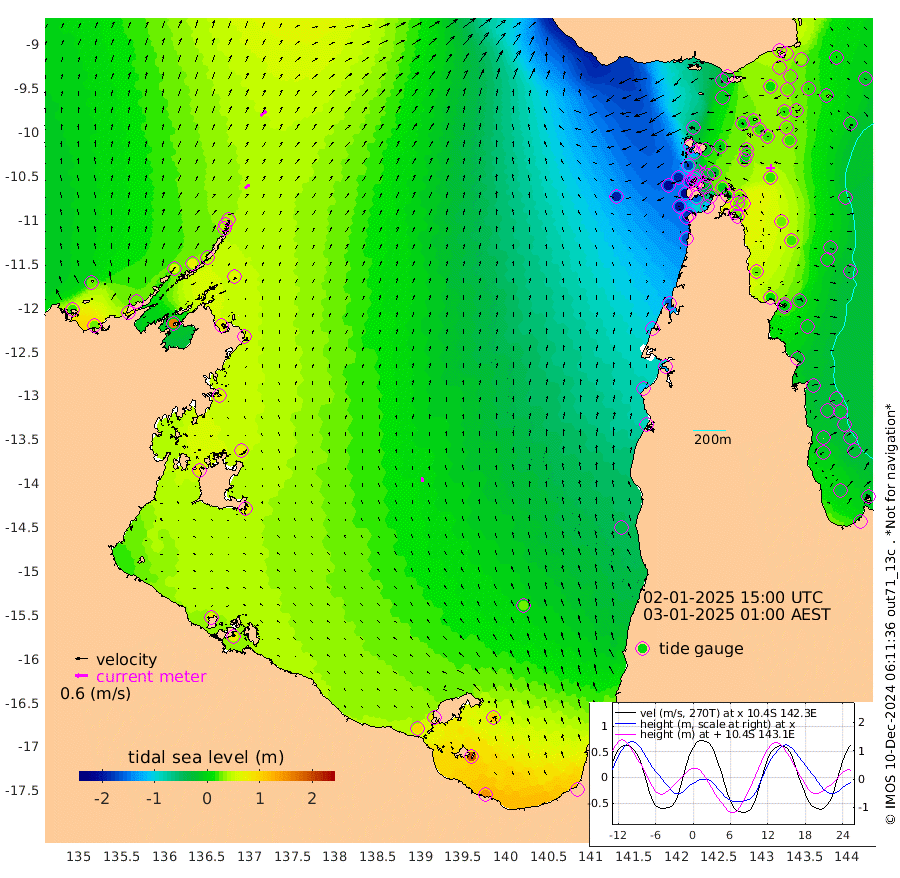 28cm/s 54T +3cm/s rms + 7cm/s -42T. ARA-GOC87 57m 22cm/s -11T +3cm/s rms + 2cm/s -2T. ARA-GOC87 60m 36cm/s 49T +2cm/s rms + 3cm/s 61T. ARA-GOC87 47m 37cm Daru 38cm Bobo Island -5cm Meer Island Barge 13cm Bramble Cay 29cm Unnamed Cay 28cm Pearce Cay 20cm Stephens Island 30cm Merrie England Shoals 35cm Mutacomal Reef 20cm Darnley Island Barge -8cm East Cay 30cm Yorke Island Barge 21cm Rennel Island 29cm Aureed Island 19cm Dungeness Reef 20cm Zagai Island 1cm Yam Island -26cm Dauan Island -17cm Saibai Island -8cm Phipi Reef 12cm Warrior Reef - West -49cm Mabuiag Island Barge 21cm Half Way Island 22cm Coconut Island 20cm Dugong Islet 14cm Poll Island 6cm Kirkcaldie Reef -3cm Suarji Island 19cm Sue Islet -172cm Hawkesbury Island -27cm Alert Patches -21cm Twin Island -141cm Badu Island -18cm St Pauls (Moa Island) -126cm Kubin (Moa Island) -59cm Ince Point -84cm Thursday Island -77cm Nardana Patches -119cm Turtle Head -137cm Round Island -175cm Goods Island -210cm Booby Island -193cm White Rocks Area -195cm Carpentaria -26cm Papou Point -212cm Bampfield Head -179cm Crab Island -201cm Red Wallis Island -156cm Packe Island 26cm Harrington Reef -193cm Herald Camp 7cm Sharp Point -107cm Red Island Point -61cm Possession Island -5cm Alpha Rock 1cm Frederick Point 34cm Wyborn Reef Light 29cm Tetley Island -9cm Triangle Reef 26cm Turtle Head Island -17cm Maclennan Cay -27cm Raine Island 23cm Mcsweeny Reef 20cm Collette Reef -4cm Shadwell Reef 26cm Hannibal Island 10cm Round Point -171cm Vrilya Point 0cm Cape Grenville -5cm Hicks Island -21cm Sir Charles Hardy Island 0cm Harvey Island -10cm Kay Reef -18cm Rocky Island -26cm Chapman Island -28cm Ham Reef -20cm Jubilee Reef -17cm Night Island -29cm Unnamed Reef No. 3 -20cm Morris Island -28cm 1st 3 Mile Opening -25cm Creech Reef -12cm Fife Island -23cm Eden Reef -20cm Stanley Island -14cm Normanby River 18cm Yabooma Island 30cm Hutchison River 25cm Elcho Island 25cm North West Crocodile Island 41cm Cape Wessel 56cm Stevens Island 70cm Guluwuru Island 43cm Hopeful Bay 44cm Auster Point 41cm Two Island Bay 68cm Cadell Strait 160cm Mallison Island 68cm Melville Bay (Gove Harbour) 65cm Truant Island 54cm Cape Arnhem 68cm Cape Grey 71cm Hawk Island 84cm Milner Bay (Groote Eylandt) 74cm Cape Beatrice 81cm West Island 77cm Centre Island 90cm Mornington Island 91cm West Wellesley Islands 111cm Bountiful Island 145cm Albert River Mouth 190cm Sweers Island 132cm Karumba 27cm Nassau River Offshore -35cm Christmas Creek -88cm Archer River -112cm Boyd Point -126cm Weipa (Humbug Point) -107cm Pennefather River -162cm Cullen Point