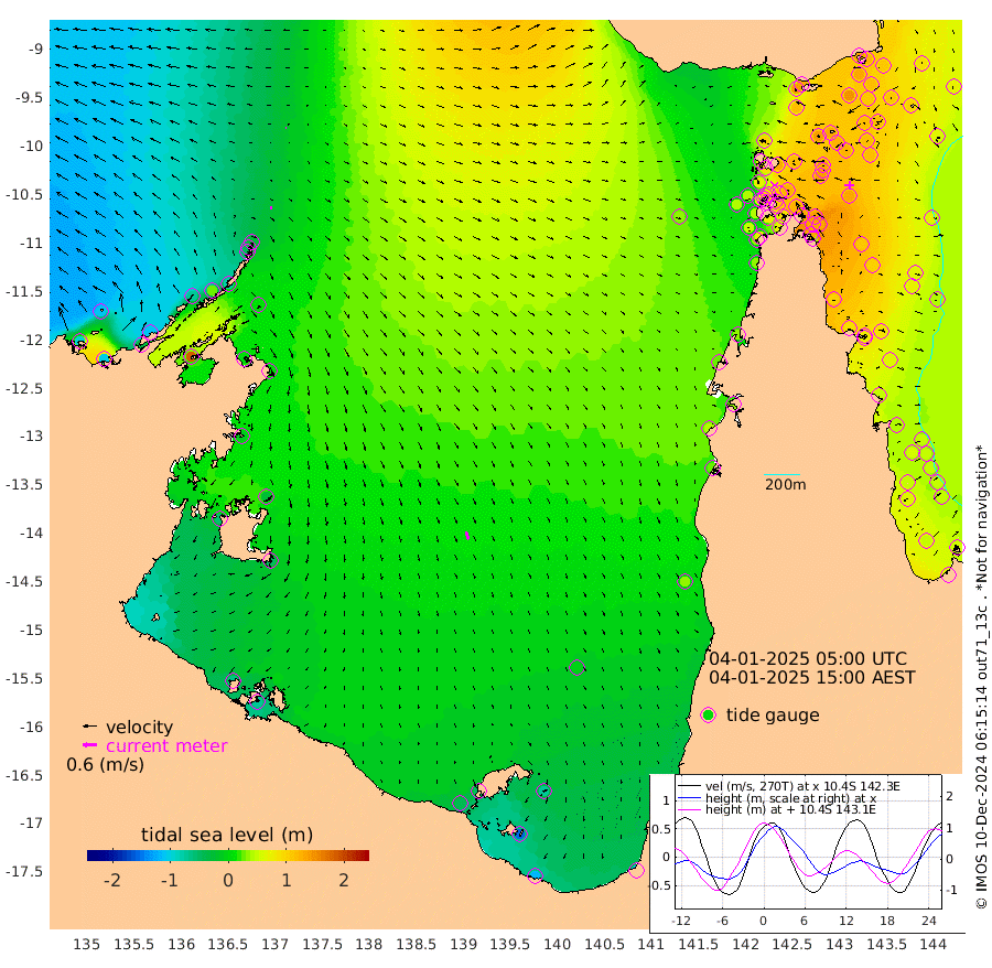 7cm/s 105T +3cm/s rms + 7cm/s -42T. ARA-GOC87 57m 35cm/s 163T +3cm/s rms + 2cm/s -2T. ARA-GOC87 60m 5cm/s -84T +2cm/s rms + 3cm/s 61T. ARA-GOC87 47m 136cm Daru 121cm Bobo Island 63cm Meer Island Barge 84cm Bramble Cay 115cm Unnamed Cay 107cm Pearce Cay 105cm Stephens Island 110cm Merrie England Shoals 133cm Mutacomal Reef 100cm Darnley Island Barge 68cm East Cay 116cm Yorke Island Barge 119cm Rennel Island 113cm Aureed Island 124cm Dungeness Reef 133cm Zagai Island 139cm Yam Island 136cm Dauan Island 132cm Saibai Island 117cm Phipi Reef 147cm Warrior Reef - West 101cm Mabuiag Island Barge 118cm Half Way Island 125cm Coconut Island 130cm Dugong Islet 129cm Poll Island 135cm Kirkcaldie Reef 118cm Suarji Island 134cm Sue Islet 71cm Hawkesbury Island 119cm Alert Patches 125cm Twin Island 72cm Badu Island 130cm St Pauls (Moa Island) 87cm Kubin (Moa Island) 109cm Ince Point 97cm Thursday Island 100cm Nardana Patches 85cm Turtle Head 66cm Round Island 56cm Goods Island 39cm Booby Island 38cm White Rocks Area 36cm Carpentaria 111cm Papou Point 44cm Bampfield Head 35cm Crab Island 49cm Red Wallis Island 79cm Packe Island 132cm Harrington Reef 70cm Herald Camp 41cm Sharp Point 70cm Red Island Point 86cm Possession Island 125cm Alpha Rock 130cm Frederick Point 134cm Wyborn Reef Light 137cm Tetley Island 68cm Triangle Reef 128cm Turtle Head Island 67cm Maclennan Cay 42cm Raine Island 109cm Mcsweeny Reef 98cm Collette Reef 68cm Shadwell Reef 101cm Hannibal Island 85cm Round Point 32cm Vrilya Point 77cm Cape Grenville 72cm Hicks Island 84cm Sir Charles Hardy Island 25cm Harvey Island 63cm Kay Reef 51cm Rocky Island 44cm Chapman Island 47cm Ham Reef 53cm Jubilee Reef 49cm Night Island 47cm Unnamed Reef No. 3 51cm Morris Island 46cm 1st 3 Mile Opening 51cm Creech Reef 60cm Fife Island 46cm Eden Reef 53cm Stanley Island 54cm Normanby River -95cm Yabooma Island -103cm Hutchison River -107cm Elcho Island -106cm North West Crocodile Island -24cm Cape Wessel -68cm Stevens Island 25cm Guluwuru Island -76cm Hopeful Bay -50cm Auster Point -41cm Two Island Bay -37cm Cadell Strait 184cm Mallison Island 3cm Melville Bay (Gove Harbour) 9cm Truant Island 10cm Cape Arnhem -13cm Cape Grey -27cm Hawk Island -57cm Milner Bay (Groote Eylandt) -50cm Cape Beatrice -61cm West Island -71cm Centre Island -47cm Mornington Island -42cm West Wellesley Islands -73cm Bountiful Island -119cm Albert River Mouth -151cm Sweers Island -109cm Karumba -6cm Nassau River Offshore 32cm Christmas Creek 26cm Archer River 41cm Boyd Point 31cm Weipa (Humbug Point) 24cm Pennefather River 36cm Cullen Point
