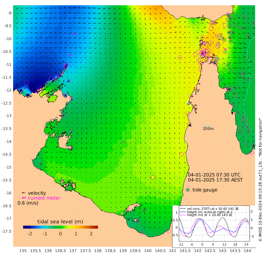37cm/s -85T +3cm/s rms + 7cm/s -42T. ARA-GOC87 57m 27cm/s 170T +3cm/s rms + 2cm/s -2T. ARA-GOC87 60m 46cm/s -94T +2cm/s rms + 3cm/s 61T. ARA-GOC87 47m 26cm Daru 6cm Bobo Island -21cm Meer Island Barge -16cm Bramble Cay 4cm Unnamed Cay -9cm Pearce Cay -6cm Stephens Island 3cm Merrie England Shoals 28cm Mutacomal Reef -7cm Darnley Island Barge -18cm East Cay 6cm Yorke Island Barge 13cm Rennel Island 7cm Aureed Island 28cm Dungeness Reef 56cm Zagai Island 70cm Yam Island 92cm Dauan Island 93cm Saibai Island 82cm Phipi Reef 73cm Warrior Reef - West 80cm Mabuiag Island Barge 13cm Half Way Island 29cm Coconut Island 25cm Dugong Islet 46cm Poll Island 55cm Kirkcaldie Reef 60cm Suarji Island 52cm Sue Islet 79cm Hawkesbury Island 69cm Alert Patches 67cm Twin Island 76cm Badu Island 76cm St Pauls (Moa Island) 76cm Kubin (Moa Island) 77cm Ince Point 80cm Thursday Island 79cm Nardana Patches 78cm Turtle Head 73cm Round Island 72cm Goods Island 79cm Booby Island 68cm White Rocks Area 85cm Carpentaria 61cm Papou Point 67cm Bampfield Head 79cm Crab Island 89cm Red Wallis Island 91cm Packe Island 26cm Harrington Reef 98cm Herald Camp 34cm Sharp Point 73cm Red Island Point 59cm Possession Island 65cm Alpha Rock 52cm Frederick Point 23cm Wyborn Reef Light 33cm Tetley Island -4cm Triangle Reef 4cm Turtle Head Island -9cm Maclennan Cay -19cm Raine Island 3cm Mcsweeny Reef 1cm Collette Reef -8cm Shadwell Reef -6cm Hannibal Island -15cm Round Point 83cm Vrilya Point -7cm Cape Grenville -15cm Hicks Island -5cm Sir Charles Hardy Island -2cm Harvey Island -15cm Kay Reef -19cm Rocky Island -20cm Chapman Island -16cm Ham Reef -18cm Jubilee Reef -12cm Night Island -13cm Unnamed Reef No. 3 -22cm Morris Island -23cm 1st 3 Mile Opening -18cm Creech Reef -17cm Fife Island -37cm Eden Reef -20cm Stanley Island -31cm Normanby River -220cm Yabooma Island -258cm Hutchison River -224cm Elcho Island -209cm North West Crocodile Island -155cm Cape Wessel -204cm Stevens Island -142cm Guluwuru Island -187cm Hopeful Bay -177cm Auster Point -173cm Two Island Bay -220cm Cadell Strait -57cm Mallison Island -136cm Melville Bay (Gove Harbour) -143cm Truant Island -90cm Cape Arnhem -75cm Cape Grey -57cm Hawk Island -43cm Milner Bay (Groote Eylandt) -23cm Cape Beatrice 16cm West Island 16cm Centre Island 31cm Mornington Island 27cm West Wellesley Islands 6cm Bountiful Island -19cm Albert River Mouth -48cm Sweers Island 1cm Karumba 62cm Nassau River Offshore 82cm Christmas Creek 67cm Archer River 69cm Boyd Point 67cm Weipa (Humbug Point) 63cm Pennefather River 86cm Cullen Point