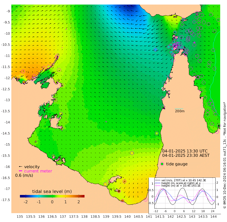 10cm/s 93T +3cm/s rms + 7cm/s -42T. ARA-GOC87 57m 18cm/s -67T +3cm/s rms + 2cm/s -2T. ARA-GOC87 60m 17cm/s 68T +2cm/s rms + 3cm/s 61T. ARA-GOC87 47m -20cm Daru -13cm Bobo Island 8cm Meer Island Barge 6cm Bramble Cay -12cm Unnamed Cay 3cm Pearce Cay -3cm Stephens Island -9cm Merrie England Shoals -25cm Mutacomal Reef -4cm Darnley Island Barge 7cm East Cay -14cm Yorke Island Barge -16cm Rennel Island -11cm Aureed Island -17cm Dungeness Reef -44cm Zagai Island -51cm Yam Island -42cm Dauan Island -64cm Saibai Island -14cm Phipi Reef -38cm Warrior Reef - West -69cm Mabuiag Island Barge -15cm Half Way Island -30cm Coconut Island -25cm Dugong Islet -36cm Poll Island -42cm Kirkcaldie Reef -48cm Suarji Island -51cm Sue Islet -77cm Hawkesbury Island -59cm Alert Patches -59cm Twin Island -66cm Badu Island -62cm St Pauls (Moa Island) -64cm Kubin (Moa Island) -65cm Ince Point -69cm Thursday Island -67cm Nardana Patches -60cm Turtle Head -67cm Round Island -64cm Goods Island -82cm Booby Island -75cm White Rocks Area -124cm Carpentaria -61cm Papou Point -102cm Bampfield Head -70cm Crab Island -83cm Red Wallis Island -64cm Packe Island -32cm Harrington Reef -82cm Herald Camp -22cm Sharp Point -61cm Red Island Point -57cm Possession Island -65cm Alpha Rock -49cm Frederick Point -33cm Wyborn Reef Light -40cm Tetley Island -3cm Triangle Reef -27cm Turtle Head Island -1cm Maclennan Cay 10cm Raine Island -11cm Mcsweeny Reef -8cm Collette Reef 1cm Shadwell Reef -3cm Hannibal Island 6cm Round Point -80cm Vrilya Point -1cm Cape Grenville 5cm Hicks Island -7cm Sir Charles Hardy Island 0cm Harvey Island 0cm Kay Reef 9cm Rocky Island 11cm Chapman Island 1cm Ham Reef 4cm Jubilee Reef 10cm Night Island 2cm Unnamed Reef No. 3 10cm Morris Island 9cm 1st 3 Mile Opening 7cm Creech Reef 13cm Fife Island 22cm Eden Reef 8cm Stanley Island 15cm Normanby River 126cm Yabooma Island 147cm Hutchison River 129cm Elcho Island 126cm North West Crocodile Island 48cm Cape Wessel 107cm Stevens Island 45cm Guluwuru Island 104cm Hopeful Bay 76cm Auster Point 77cm Two Island Bay 125cm Cadell Strait -15cm Mallison Island 57cm Melville Bay (Gove Harbour) 50cm Truant Island 35cm Cape Arnhem 35cm Cape Grey 48cm Hawk Island 44cm Milner Bay (Groote Eylandt) 46cm Cape Beatrice 31cm West Island 33cm Centre Island 92cm Mornington Island 86cm West Wellesley Islands 130cm Bountiful Island 182cm Albert River Mouth 199cm Sweers Island 176cm Karumba 79cm Nassau River Offshore 35cm Christmas Creek -4cm Archer River -38cm Boyd Point -21cm Weipa (Humbug Point) -39cm Pennefather River -68cm Cullen Point