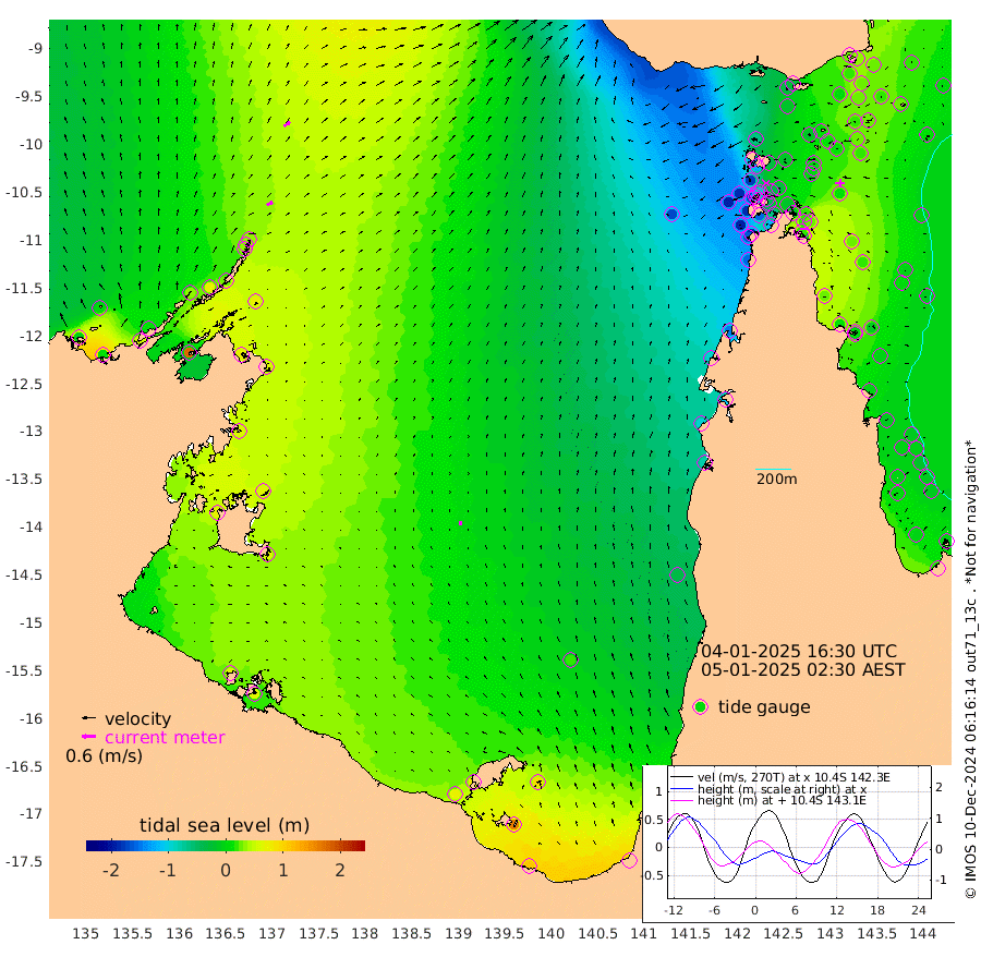 27cm/s 61T +3cm/s rms + 7cm/s -42T. ARA-GOC87 57m 16cm/s -8T +3cm/s rms + 2cm/s -2T. ARA-GOC87 60m 33cm/s 51T +2cm/s rms + 3cm/s 61T. ARA-GOC87 47m 30cm Daru 32cm Bobo Island 8cm Meer Island Barge 16cm Bramble Cay 24cm Unnamed Cay 23cm Pearce Cay 22cm Stephens Island 24cm Merrie England Shoals 21cm Mutacomal Reef 25cm Darnley Island Barge 3cm East Cay 28cm Yorke Island Barge 16cm Rennel Island 26cm Aureed Island 12cm Dungeness Reef 8cm Zagai Island -15cm Yam Island -34cm Dauan Island -30cm Saibai Island -19cm Phipi Reef 0cm Warrior Reef - West -61cm Mabuiag Island Barge 16cm Half Way Island 14cm Coconut Island 11cm Dugong Islet 0cm Poll Island -6cm Kirkcaldie Reef -16cm Suarji Island 6cm Sue Islet -173cm Hawkesbury Island -37cm Alert Patches -34cm Twin Island -142cm Badu Island -31cm St Pauls (Moa Island) -126cm Kubin (Moa Island) -67cm Ince Point -90cm Thursday Island -83cm Nardana Patches -118cm Turtle Head -132cm Round Island -167cm Goods Island -195cm Booby Island -187cm White Rocks Area -172cm Carpentaria -39cm Papou Point -187cm Bampfield Head -164cm Crab Island -191cm Red Wallis Island -152cm Packe Island 16cm Harrington Reef -180cm Herald Camp 0cm Sharp Point -113cm Red Island Point -63cm Possession Island -19cm Alpha Rock -11cm Frederick Point 23cm Wyborn Reef Light 17cm Tetley Island -2cm Triangle Reef 21cm Turtle Head Island -6cm Maclennan Cay -11cm Raine Island 23cm Mcsweeny Reef 22cm Collette Reef 7cm Shadwell Reef 27cm Hannibal Island 13cm Round Point -154cm Vrilya Point 6cm Cape Grenville 4cm Hicks Island -11cm Sir Charles Hardy Island 3cm Harvey Island -1cm Kay Reef -5cm Rocky Island -13cm Chapman Island -13cm Ham Reef -6cm Jubilee Reef -3cm Night Island -15cm Unnamed Reef No. 3 -5cm Morris Island -9cm 1st 3 Mile Opening -8cm Creech Reef 7cm Fife Island -6cm Eden Reef -5cm Stanley Island -2cm Normanby River -3cm Yabooma Island 12cm Hutchison River 8cm Elcho Island 1cm North West Crocodile Island 35cm Cape Wessel 37cm Stevens Island 74cm Guluwuru Island 29cm Hopeful Bay 36cm Auster Point 33cm Two Island Bay 56cm Cadell Strait 179cm Mallison Island 69cm Melville Bay (Gove Harbour) 69cm Truant Island 60cm Cape Arnhem 66cm Cape Grey 67cm Hawk Island 73cm Milner Bay (Groote Eylandt) 62cm Cape Beatrice 64cm West Island 61cm Centre Island 76cm Mornington Island 74cm West Wellesley Islands 84cm Bountiful Island 112cm Albert River Mouth 158cm Sweers Island 101cm Karumba 17cm Nassau River Offshore -33cm Christmas Creek -77cm Archer River -95cm Boyd Point -110cm Weipa (Humbug Point) -91cm Pennefather River -145cm Cullen Point