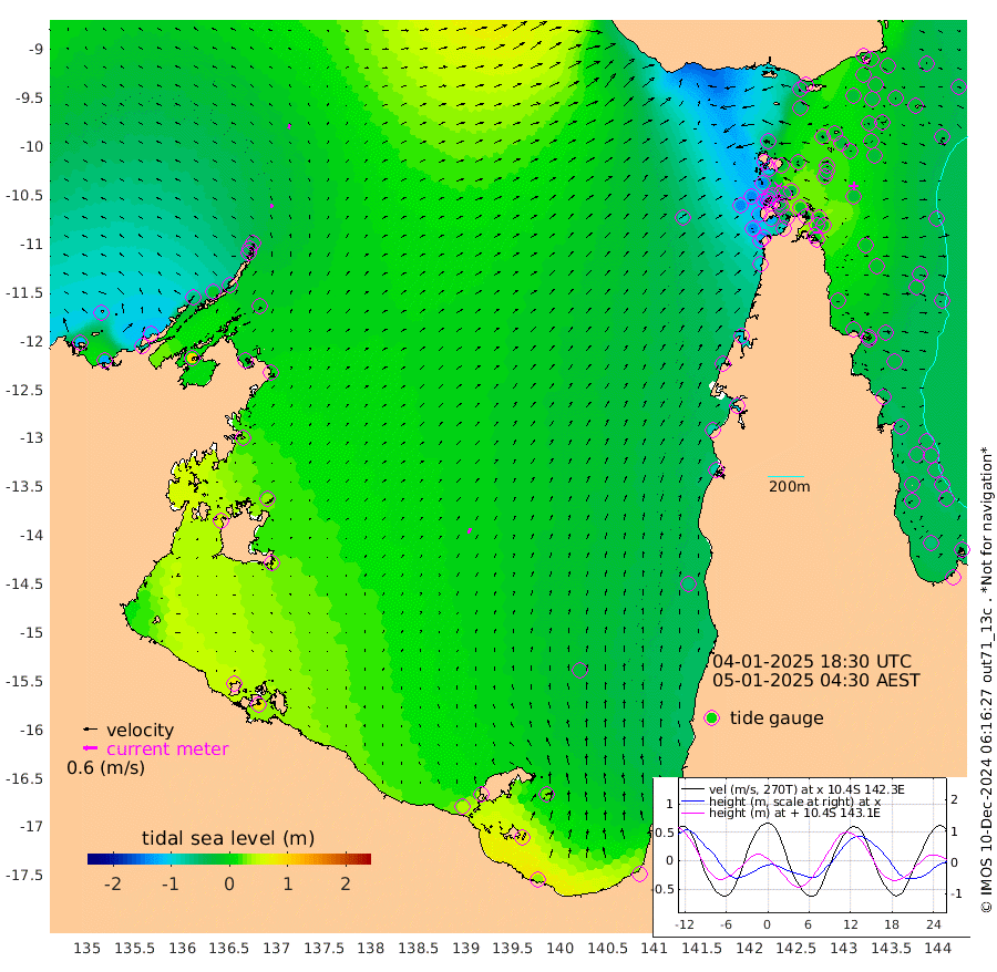 17cm/s 13T +3cm/s rms + 7cm/s -42T. ARA-GOC87 57m 24cm/s 17T +3cm/s rms + 2cm/s -2T. ARA-GOC87 60m 17cm/s 19T +2cm/s rms + 3cm/s 61T. ARA-GOC87 47m -12cm Daru -13cm Bobo Island -34cm Meer Island Barge -32cm Bramble Cay -19cm Unnamed Cay -32cm Pearce Cay -26cm Stephens Island -18cm Merrie England Shoals -14cm Mutacomal Reef -20cm Darnley Island Barge -41cm East Cay -13cm Yorke Island Barge -24cm Rennel Island -17cm Aureed Island -27cm Dungeness Reef -8cm Zagai Island -27cm Yam Island -50cm Dauan Island -25cm Saibai Island -47cm Phipi Reef -25cm Warrior Reef - West -40cm Mabuiag Island Barge -24cm Half Way Island -13cm Coconut Island -24cm Dugong Islet -22cm Poll Island -25cm Kirkcaldie Reef -21cm Suarji Island -5cm Sue Islet -139cm Hawkesbury Island -32cm Alert Patches -33cm Twin Island -117cm Badu Island -29cm St Pauls (Moa Island) -108cm Kubin (Moa Island) -53cm Ince Point -68cm Thursday Island -64cm Nardana Patches -100cm Turtle Head -101cm Round Island -137cm Goods Island -142cm Booby Island -141cm White Rocks Area -80cm Carpentaria -32cm Papou Point -122cm Bampfield Head -117cm Crab Island -141cm Red Wallis Island -127cm Packe Island -14cm Harrington Reef -138cm Herald Camp 6cm Sharp Point -90cm Red Island Point -48cm Possession Island -13cm Alpha Rock -22cm Frederick Point -7cm Wyborn Reef Light -8cm Tetley Island -35cm Triangle Reef -16cm Turtle Head Island -41cm Maclennan Cay -46cm Raine Island -17cm Mcsweeny Reef -17cm Collette Reef -29cm Shadwell Reef -19cm Hannibal Island -36cm Round Point -96cm Vrilya Point -31cm Cape Grenville -39cm Hicks Island -49cm Sir Charles Hardy Island -10cm Harvey Island -36cm Kay Reef -42cm Rocky Island -49cm Chapman Island -43cm Ham Reef -41cm Jubilee Reef -38cm Night Island -45cm Unnamed Reef No. 3 -44cm Morris Island -45cm 1st 3 Mile Opening -44cm Creech Reef -38cm Fife Island -56cm Eden Reef -43cm Stanley Island -48cm Normanby River -115cm Yabooma Island -122cm Hutchison River -99cm Elcho Island -102cm North West Crocodile Island -32cm Cape Wessel -66cm Stevens Island -9cm Guluwuru Island -63cm Hopeful Bay -44cm Auster Point -52cm Two Island Bay -82cm Cadell Strait 92cm Mallison Island -10cm Melville Bay (Gove Harbour) -9cm Truant Island 7cm Cape Arnhem 30cm Cape Grey 33cm Hawk Island 63cm Milner Bay (Groote Eylandt) 51cm Cape Beatrice 82cm West Island 83cm Centre Island 41cm Mornington Island 40cm West Wellesley Islands 27cm Bountiful Island 32cm Albert River Mouth 79cm Sweers Island 25cm Karumba -25cm Nassau River Offshore -59cm Christmas Creek -76cm Archer River -76cm Boyd Point -100cm Weipa (Humbug Point) -62cm Pennefather River -97cm Cullen Point