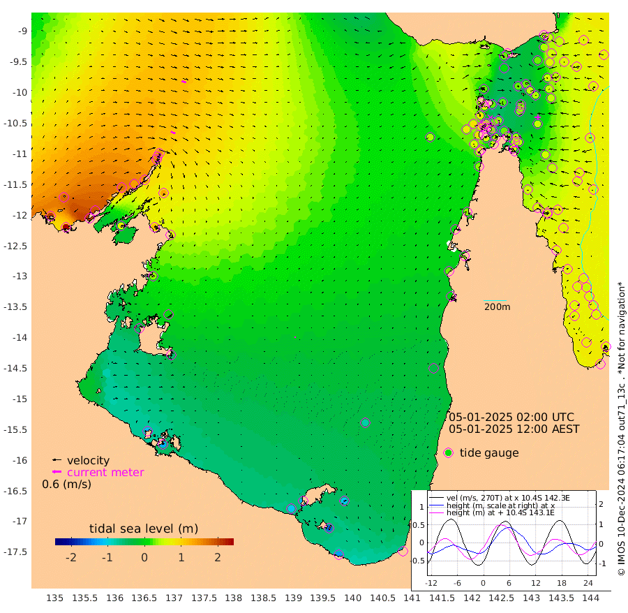 32cm/s 116T +3cm/s rms + 7cm/s -42T. ARA-GOC87 57m 8cm/s 170T +3cm/s rms + 2cm/s -2T. ARA-GOC87 60m 31cm/s 108T +2cm/s rms + 3cm/s 61T. ARA-GOC87 47m 42cm Daru 53cm Bobo Island 64cm Meer Island Barge 65cm Bramble Cay 55cm Unnamed Cay 68cm Pearce Cay 63cm Stephens Island 50cm Merrie England Shoals 41cm Mutacomal Reef 59cm Darnley Island Barge 69cm East Cay 52cm Yorke Island Barge 55cm Rennel Island 51cm Aureed Island 46cm Dungeness Reef 25cm Zagai Island 30cm Yam Island 28cm Dauan Island 17cm Saibai Island 13cm Phipi Reef 26cm Warrior Reef - West 26cm Mabuiag Island Barge 52cm Half Way Island 40cm Coconut Island 51cm Dugong Islet 36cm Poll Island 33cm Kirkcaldie Reef 26cm Suarji Island 28cm Sue Islet 88cm Hawkesbury Island 28cm Alert Patches 32cm Twin Island 70cm Badu Island 26cm St Pauls (Moa Island) 69cm Kubin (Moa Island) 35cm Ince Point 41cm Thursday Island 39cm Nardana Patches 58cm Turtle Head 62cm Round Island 82cm Goods Island 79cm Booby Island 84cm White Rocks Area 43cm Carpentaria 34cm Papou Point 90cm Bampfield Head 53cm Crab Island 72cm Red Wallis Island 63cm Packe Island 45cm Harrington Reef 74cm Herald Camp -11cm Sharp Point 49cm Red Island Point 38cm Possession Island 23cm Alpha Rock 36cm Frederick Point 46cm Wyborn Reef Light 42cm Tetley Island 56cm Triangle Reef 64cm Turtle Head Island 64cm Maclennan Cay 63cm Raine Island 53cm Mcsweeny Reef 50cm Collette Reef 53cm Shadwell Reef 55cm Hannibal Island 67cm Round Point 34cm Vrilya Point 56cm Cape Grenville 67cm Hicks Island 75cm Sir Charles Hardy Island 18cm Harvey Island 61cm Kay Reef 64cm Rocky Island 67cm Chapman Island 64cm Ham Reef 65cm Jubilee Reef 52cm Night Island 62cm Unnamed Reef No. 3 67cm Morris Island 68cm 1st 3 Mile Opening 65cm Creech Reef 61cm Fife Island 81cm Eden Reef 65cm Stanley Island 76cm Normanby River 204cm Yabooma Island 233cm Hutchison River 189cm Elcho Island 179cm North West Crocodile Island 144cm Cape Wessel 170cm Stevens Island 136cm Guluwuru Island 151cm Hopeful Bay 152cm Auster Point 156cm Two Island Bay 204cm Cadell Strait 70cm Mallison Island 117cm Melville Bay (Gove Harbour) 130cm Truant Island 73cm Cape Arnhem 32cm Cape Grey 1cm Hawk Island -47cm Milner Bay (Groote Eylandt) -56cm Cape Beatrice -114cm West Island -120cm Centre Island -117cm Mornington Island -108cm West Wellesley Islands -105cm Bountiful Island -130cm Albert River Mouth -154cm Sweers Island -137cm Karumba -78cm Nassau River Offshore -37cm Christmas Creek 3cm Archer River 23cm Boyd Point 31cm Weipa (Humbug Point) 6cm Pennefather River 32cm Cullen Point