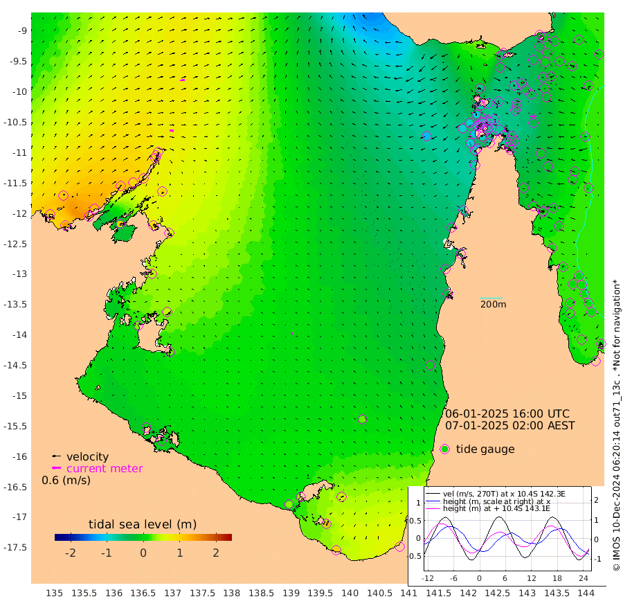 28cm/s 97T +3cm/s rms + 7cm/s -42T. ARA-GOC87 57m 10cm/s -58T +3cm/s rms + 2cm/s -2T. ARA-GOC87 60m 30cm/s 81T +2cm/s rms + 3cm/s 61T. ARA-GOC87 47m -23cm Daru -14cm Bobo Island 9cm Meer Island Barge 0cm Bramble Cay -20cm Unnamed Cay -3cm Pearce Cay -7cm Stephens Island -19cm Merrie England Shoals -37cm Mutacomal Reef -3cm Darnley Island Barge 4cm East Cay -14cm Yorke Island Barge -23cm Rennel Island -13cm Aureed Island -27cm Dungeness Reef -43cm Zagai Island -61cm Yam Island -42cm Dauan Island -59cm Saibai Island -34cm Phipi Reef -41cm Warrior Reef - West -73cm Mabuiag Island Barge -24cm Half Way Island -34cm Coconut Island -35cm Dugong Islet -45cm Poll Island -53cm Kirkcaldie Reef -60cm Suarji Island -52cm Sue Islet -101cm Hawkesbury Island -69cm Alert Patches -69cm Twin Island -78cm Badu Island -69cm St Pauls (Moa Island) -81cm Kubin (Moa Island) -75cm Ince Point -80cm Thursday Island -78cm Nardana Patches -76cm Turtle Head -89cm Round Island -83cm Goods Island -97cm Booby Island -96cm White Rocks Area -114cm Carpentaria -69cm Papou Point -111cm Bampfield Head -79cm Crab Island -98cm Red Wallis Island -85cm Packe Island -40cm Harrington Reef -110cm Herald Camp -25cm Sharp Point -80cm Red Island Point -72cm Possession Island -70cm Alpha Rock -55cm Frederick Point -36cm Wyborn Reef Light -43cm Tetley Island -3cm Triangle Reef -28cm Turtle Head Island -3cm Maclennan Cay 12cm Raine Island -12cm Mcsweeny Reef -10cm Collette Reef 2cm Shadwell Reef -7cm Hannibal Island 0cm Round Point -81cm Vrilya Point -9cm Cape Grenville 1cm Hicks Island -10cm Sir Charles Hardy Island -1cm Harvey Island -5cm Kay Reef 7cm Rocky Island 9cm Chapman Island 3cm Ham Reef 7cm Jubilee Reef 9cm Night Island 4cm Unnamed Reef No. 3 9cm Morris Island 11cm 1st 3 Mile Opening 7cm Creech Reef 21cm Fife Island 19cm Eden Reef 6cm Stanley Island 9cm Normanby River 110cm Yabooma Island 137cm Hutchison River 119cm Elcho Island 108cm North West Crocodile Island 76cm Cape Wessel 114cm Stevens Island 92cm Guluwuru Island 104cm Hopeful Bay 92cm Auster Point 92cm Two Island Bay 147cm Cadell Strait 112cm Mallison Island 92cm Melville Bay (Gove Harbour) 92cm Truant Island 67cm Cape Arnhem 50cm Cape Grey 48cm Hawk Island 34cm Milner Bay (Groote Eylandt) 28cm Cape Beatrice 1cm West Island -1cm Centre Island 41cm Mornington Island 37cm West Wellesley Islands 55cm Bountiful Island 98cm Albert River Mouth 118cm Sweers Island 87cm Karumba 26cm Nassau River Offshore -2cm Christmas Creek -23cm Archer River -43cm Boyd Point -38cm Weipa (Humbug Point) -40cm Pennefather River -76cm Cullen Point